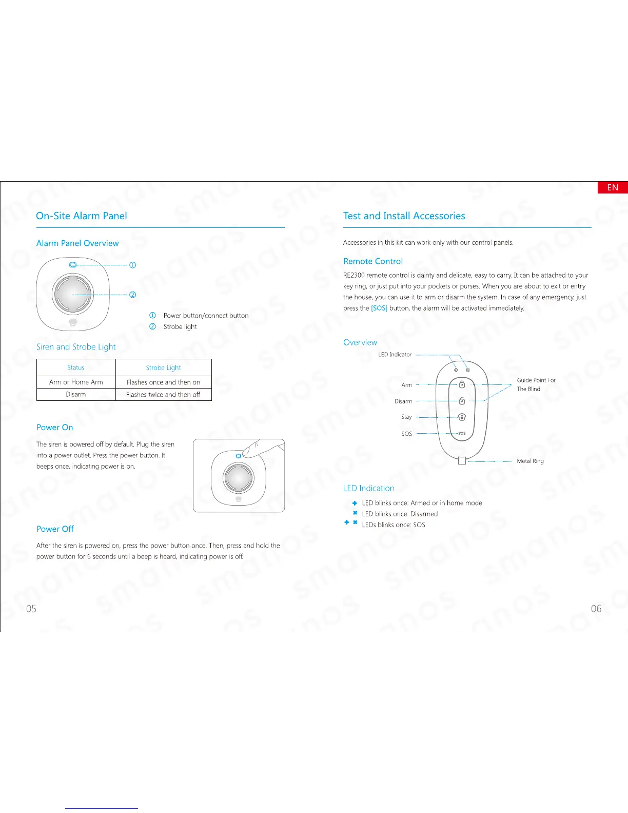 Smanos S105 - On-Site Alarm Panel; Power On; Power Off; Test and Install Accessories