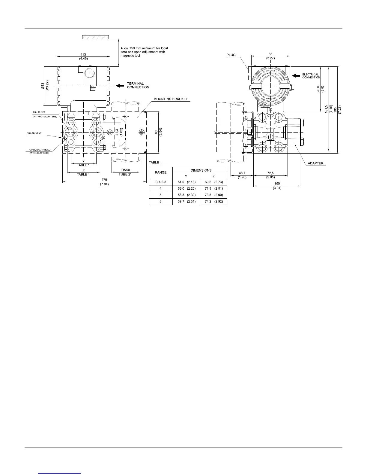 Figure 1.1 (a) – Dimensional Drawing and Mounting Position - Differential, Flow, Gage, Absolute and High Static Pressure