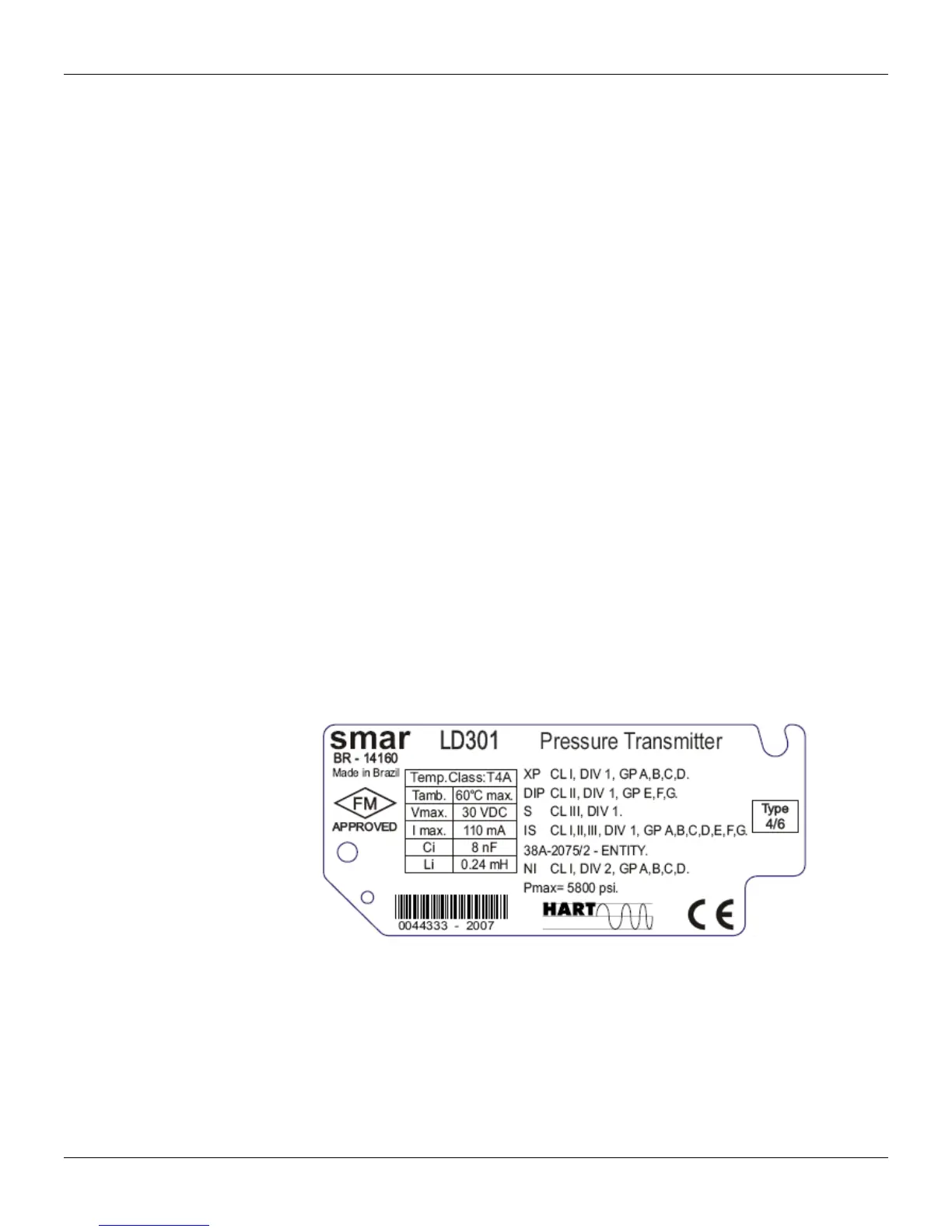 • Entity Parameters: Ui = 28 Vdc Ii = 93 mA Ci ≤ 5 nF Li = neg