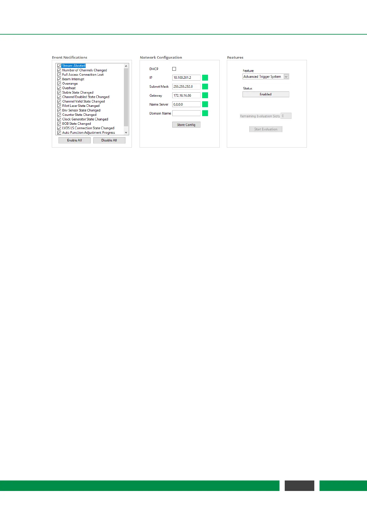 Figure 7.3: General Settings: (left) Configuration menu for Event Notification. (center) Network Con-