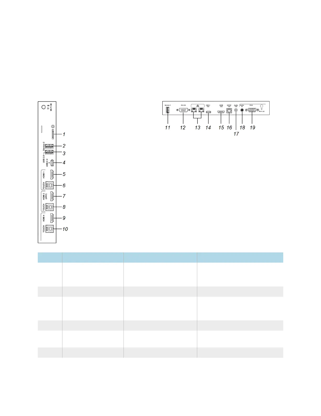 This diagram and table present the connectors on the display’s side and bottom connector panels: