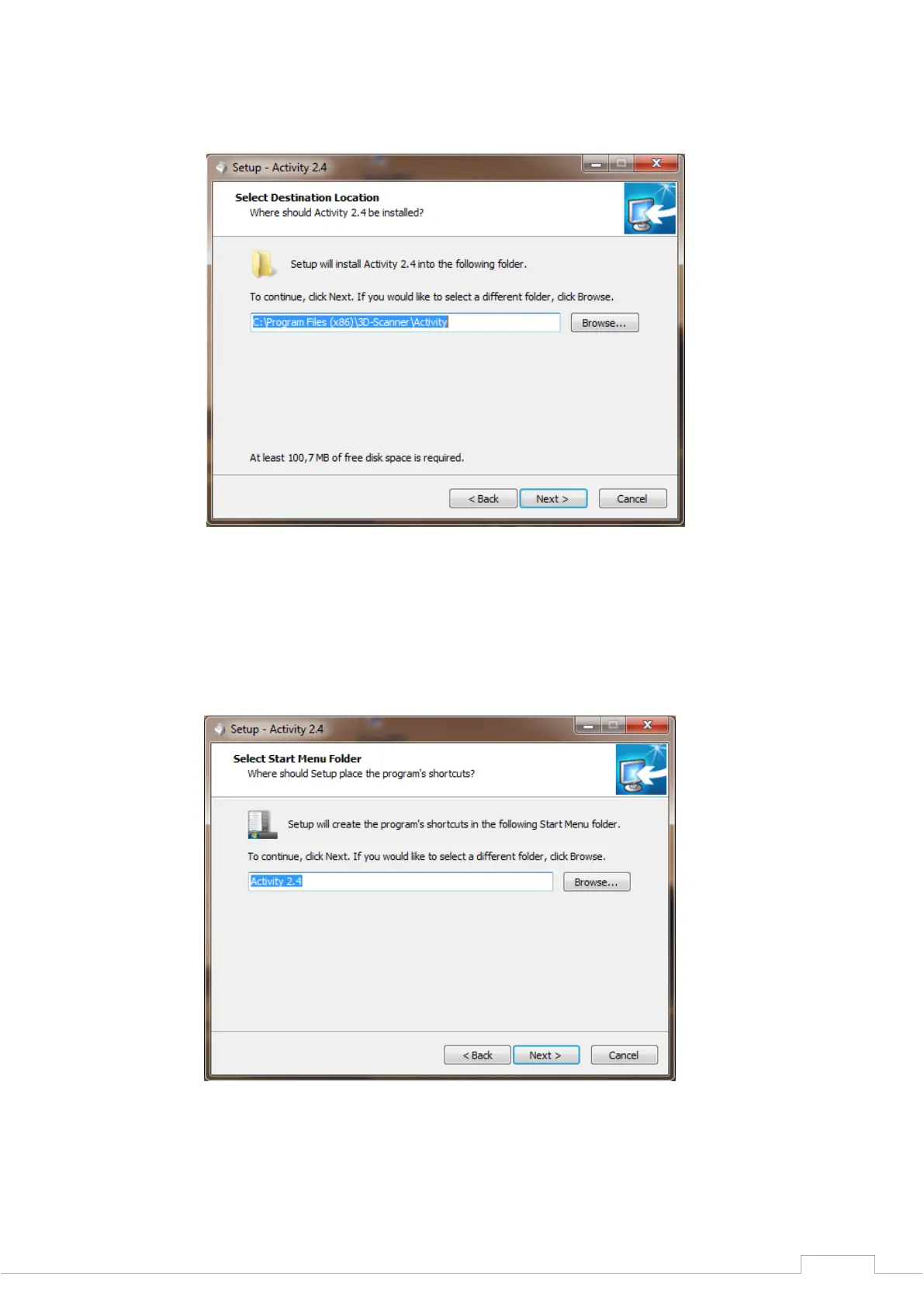 Smart Optics Activity 850 - Figure 8: Select Installation Location; Figure 9: Start Menu