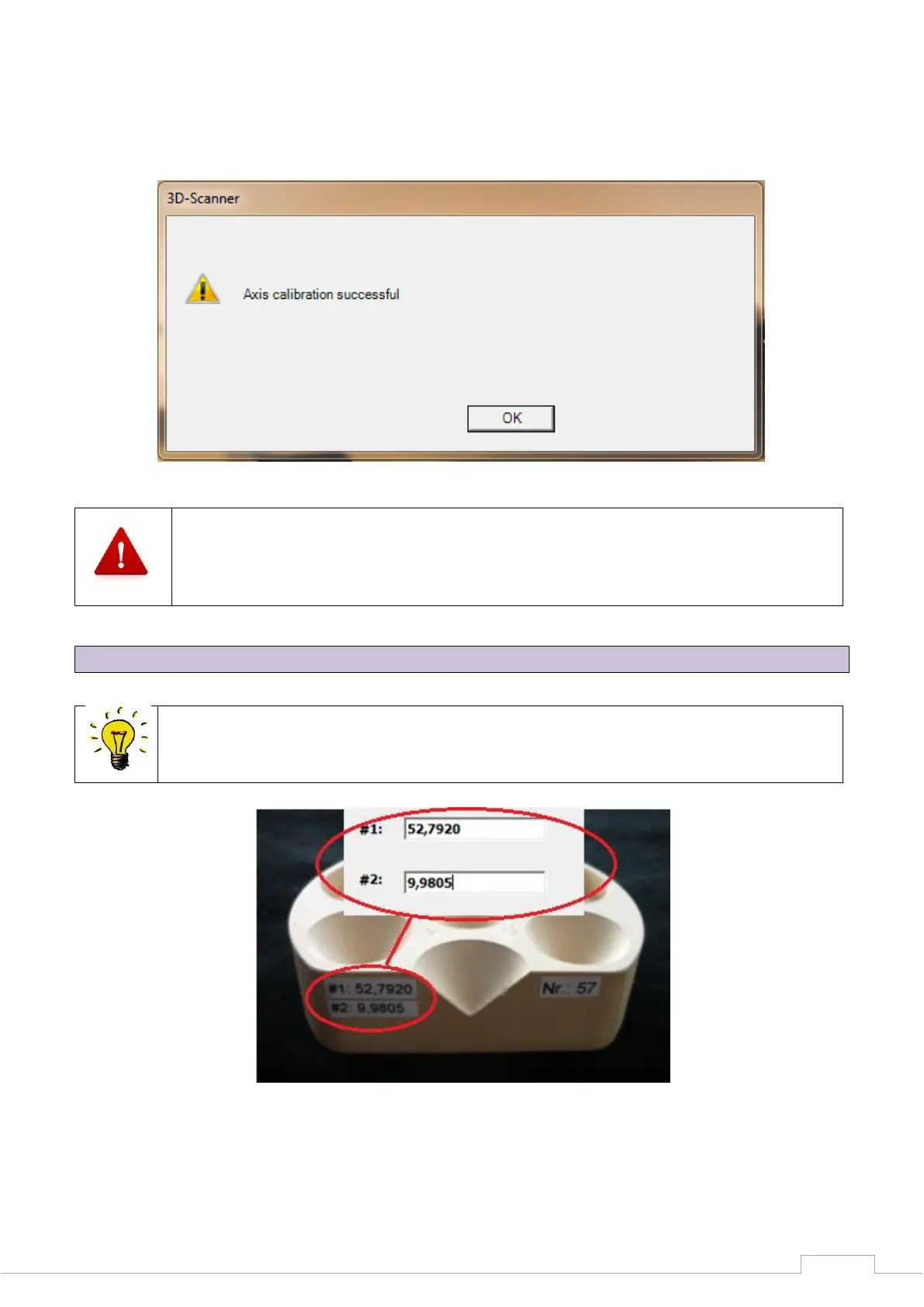 The scanner now performs an automatic axis calibration. The following message will appear after
