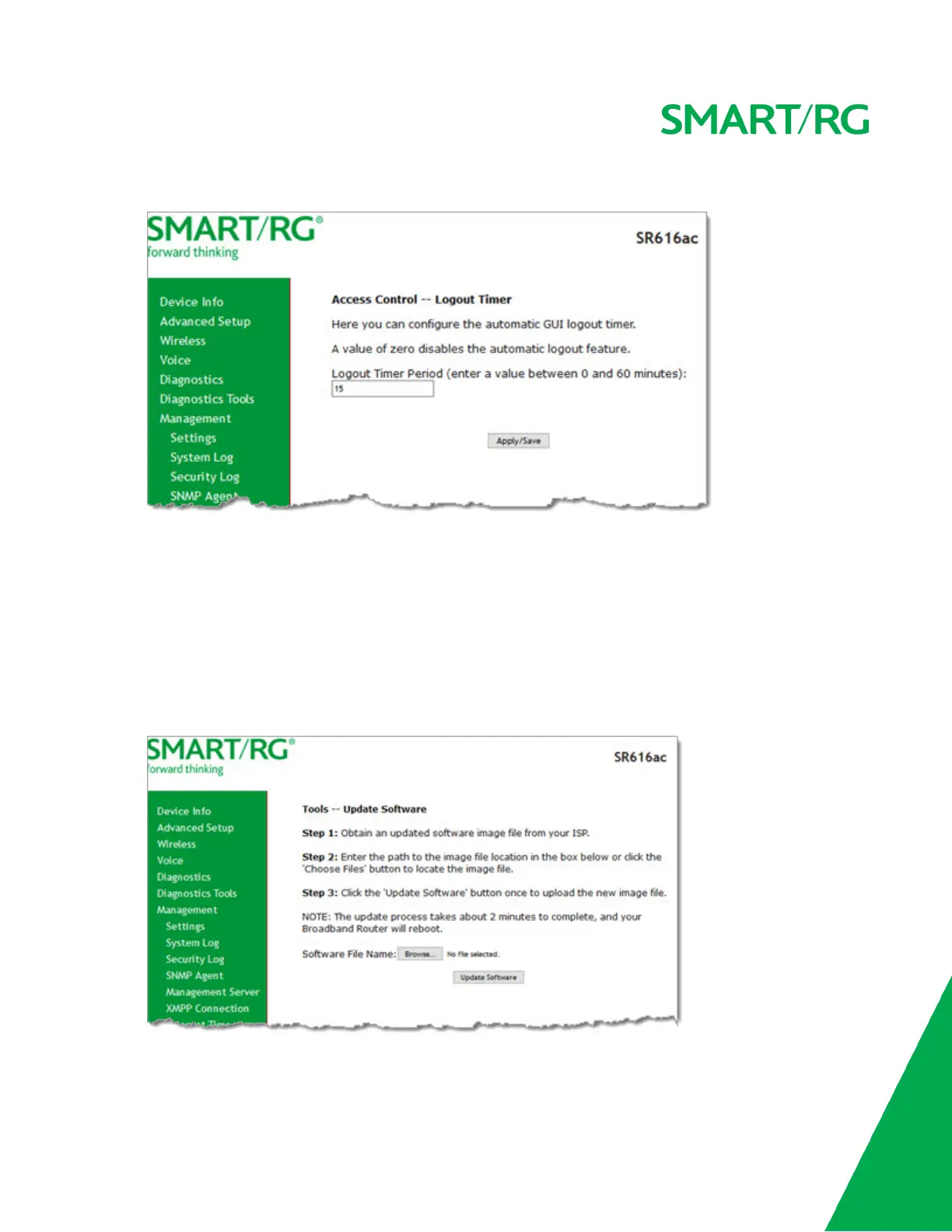 On this page, you can update the firmware of your gateway. Software updates for SmartRG product are available for download by