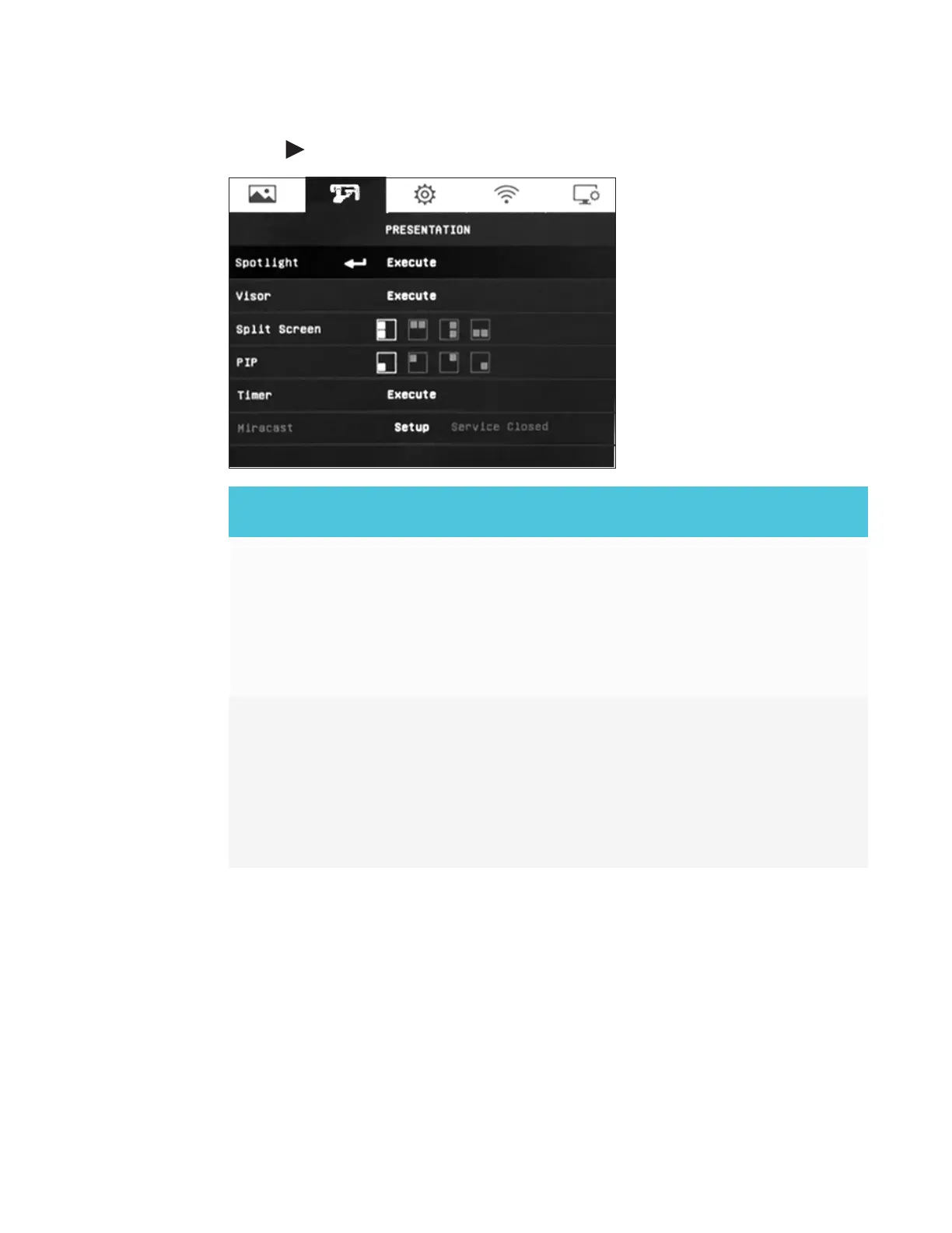 Visor Select to coves the presentation screen. The top part of the