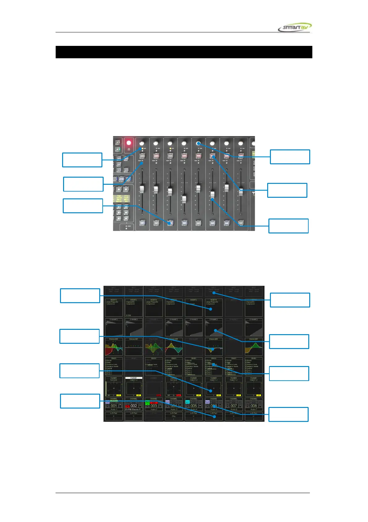 The main channel area consists of 8 work channel strips. Each strip consists of hardware controls and 8