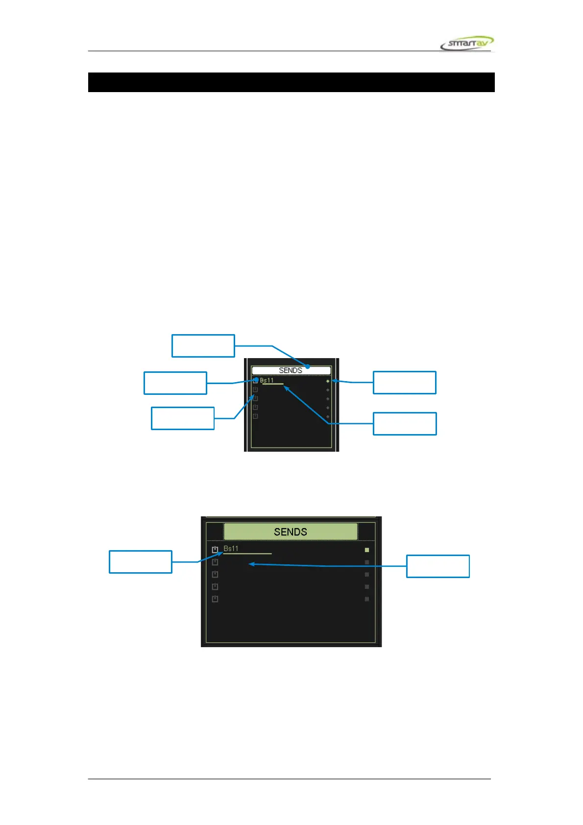 send on/off, name, level and pre/post status. The title indicator will turn white if any one of the sends