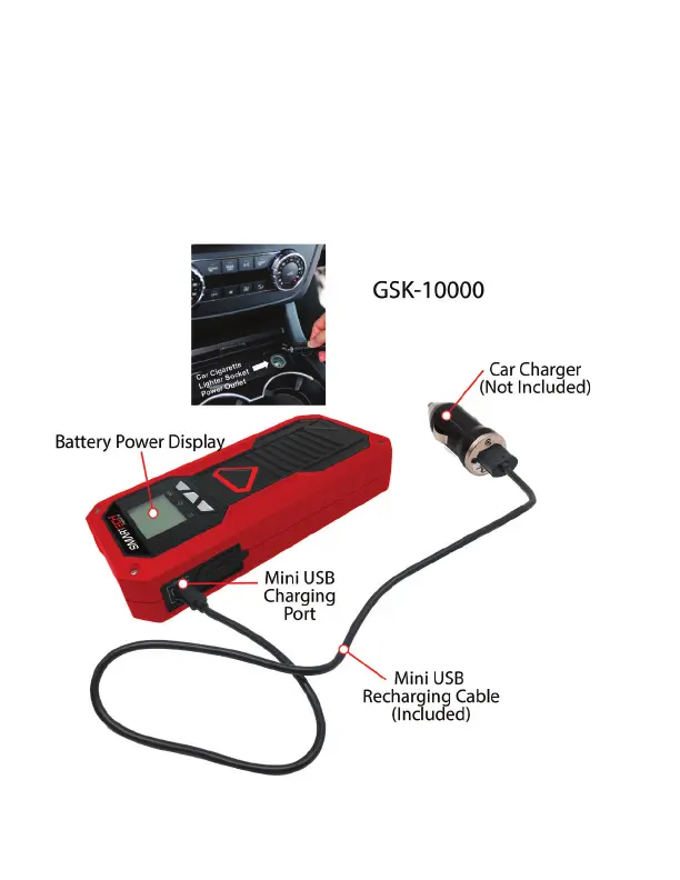 To charge the GSK-10000 from your car, plug the Mini USB
