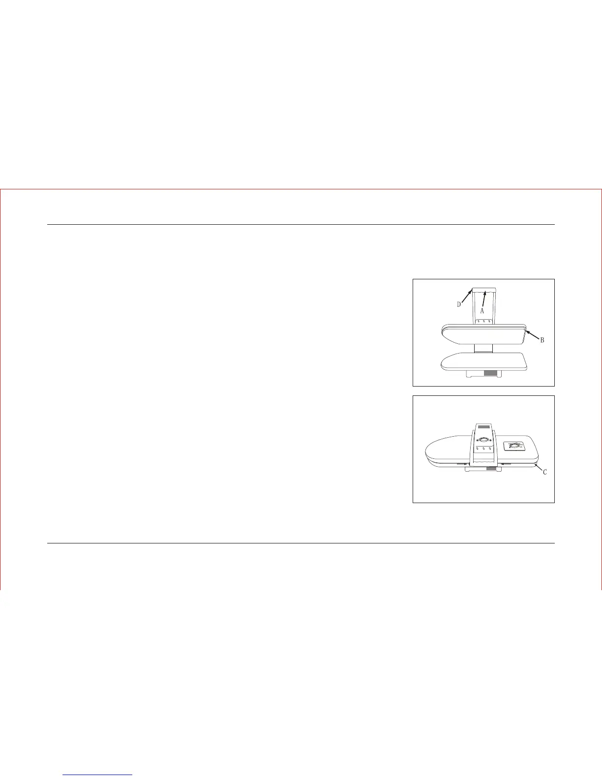 c. Grasp the handle of the Pressing Plate(A) and lower it onto the Ironing Board (C),capturing