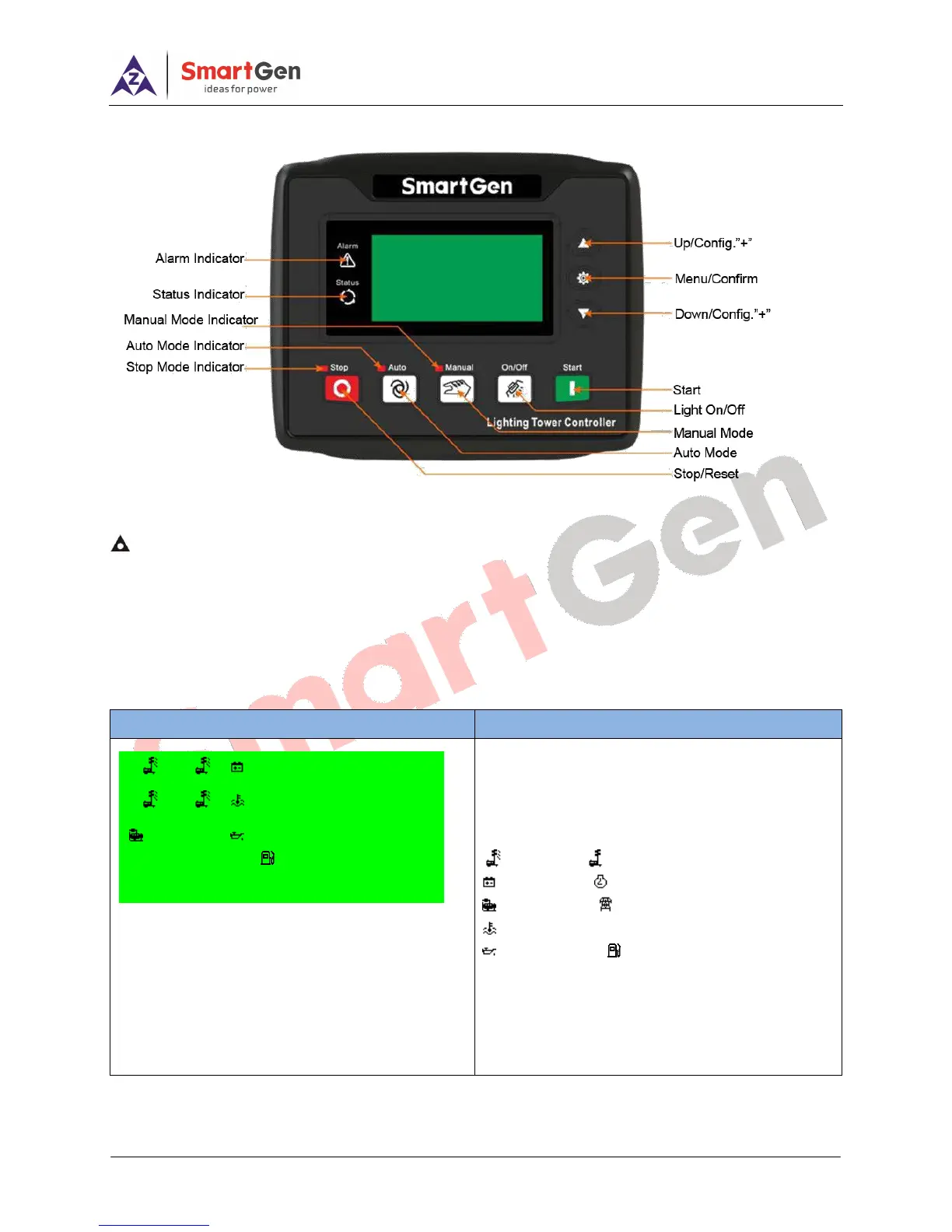 Status Indicator: not illuminate while genset is standby; normally illuminate while genset is normal running.