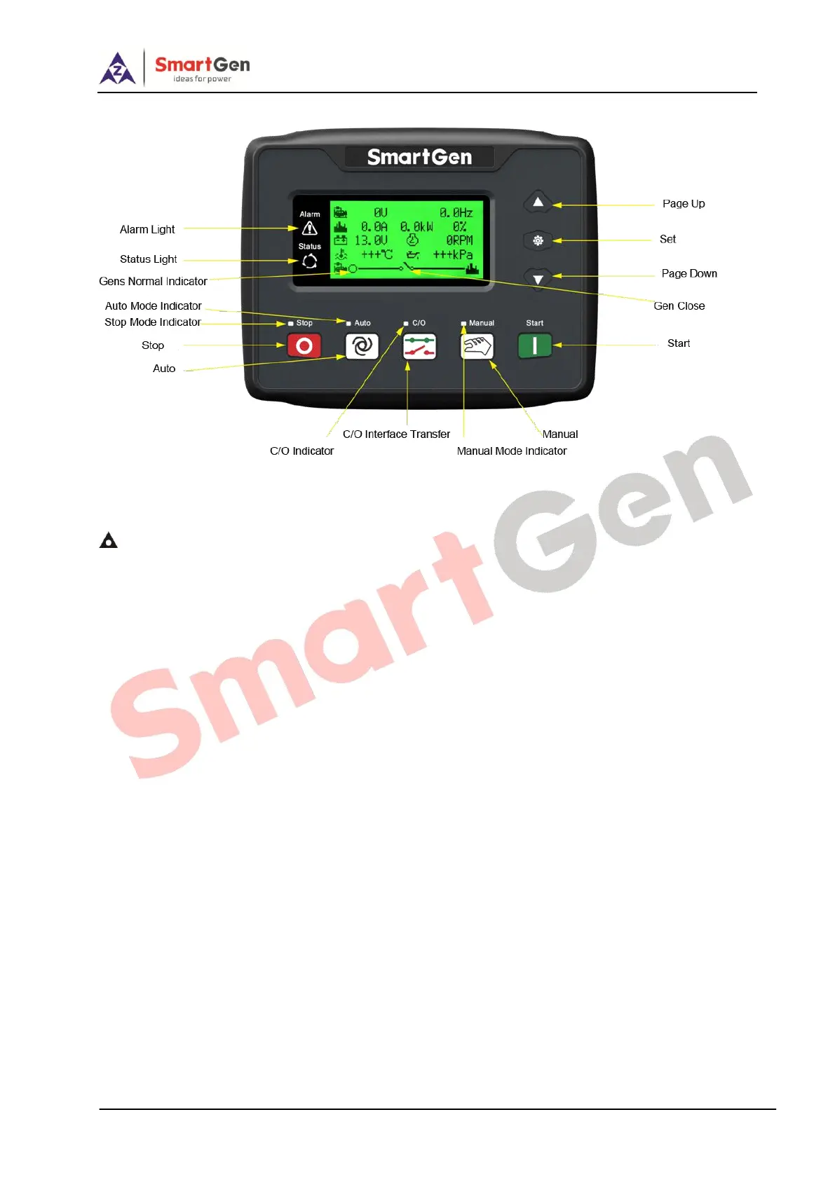 Status Indicators: Light is off when genset is standby; flash once per second during startup or shutdown; it is