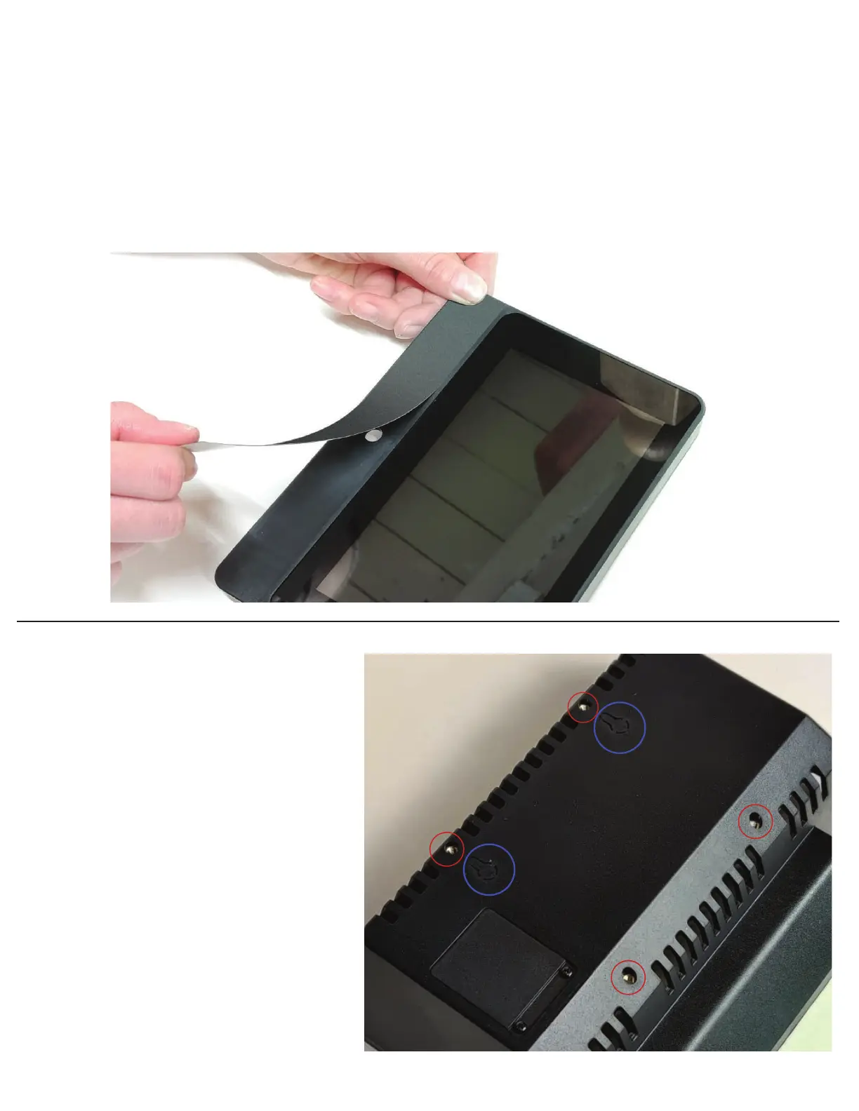 camera hole. Align the label with the small edge in the plastic below the display. Do not have the plastic