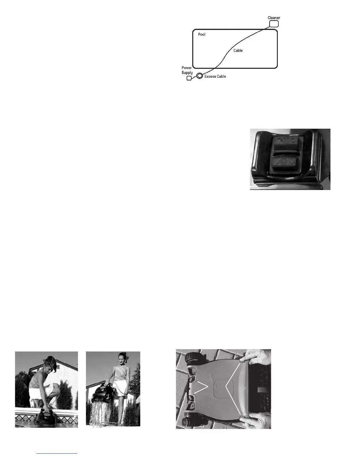 • Place the cleaner into the pool and rock the cleaner side to side to release any trapped air. The cleaner will sink to the bottom of the pool.