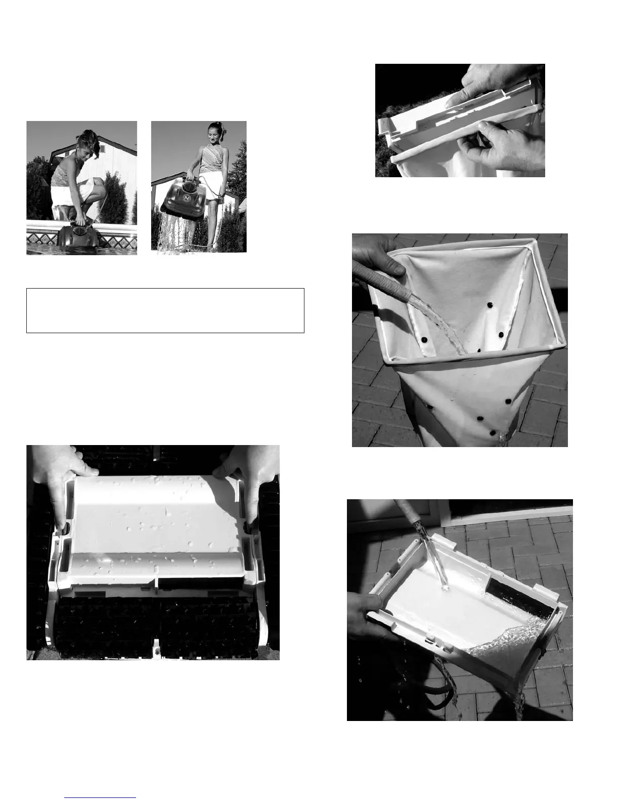 • Retournez le sac à filtre et nettoyez les débris à l'aide d'un jet d'eau tel qu'indiqué à l'image 5.