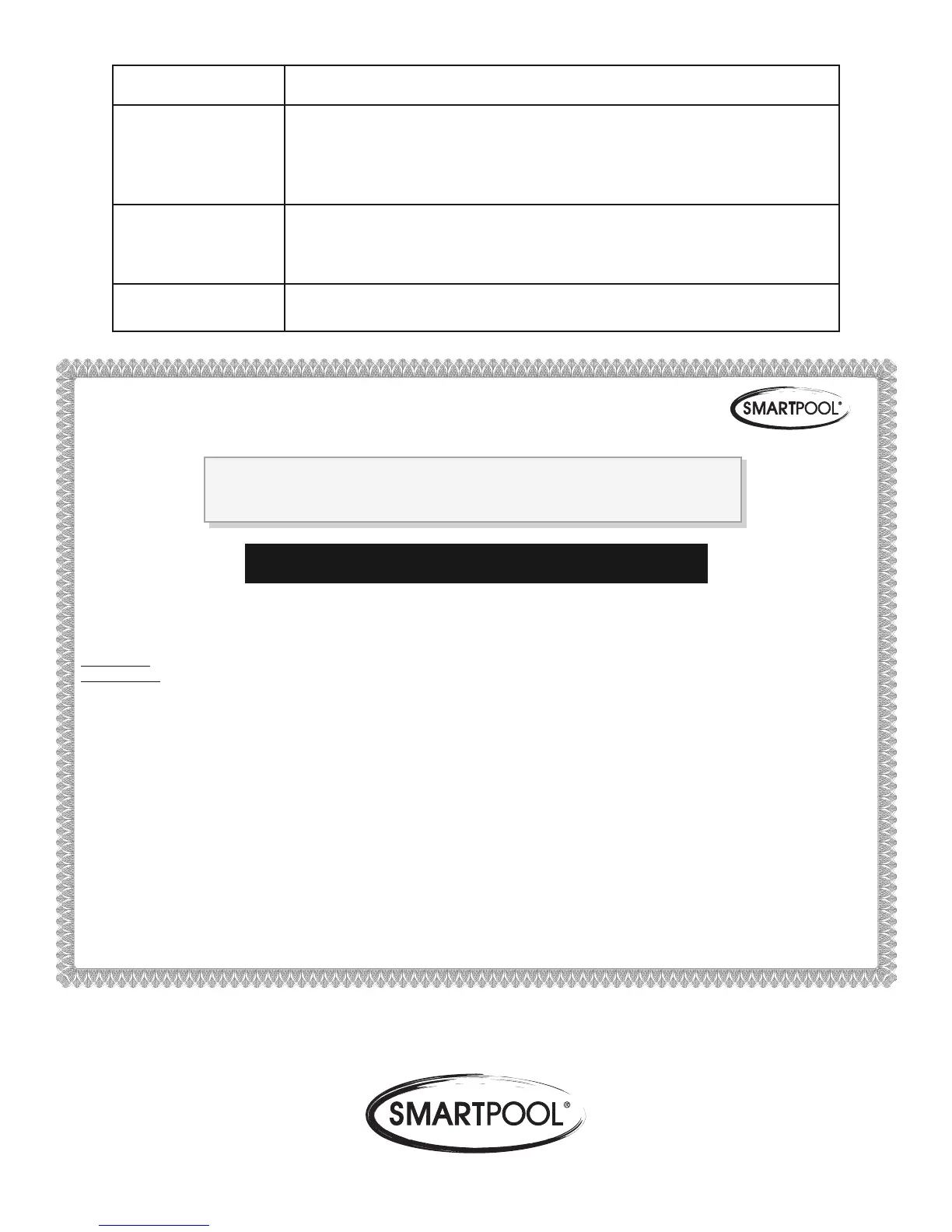 OTHER, MADE BY SMARTPOOL, INC., OTHER THAN THOSE SPECIFICALLY SET FORTH IN THIS WARRANTY. NO PERSON, FIRM, OR CORPORATION IS AUTHORIZED TO MAKE ANY