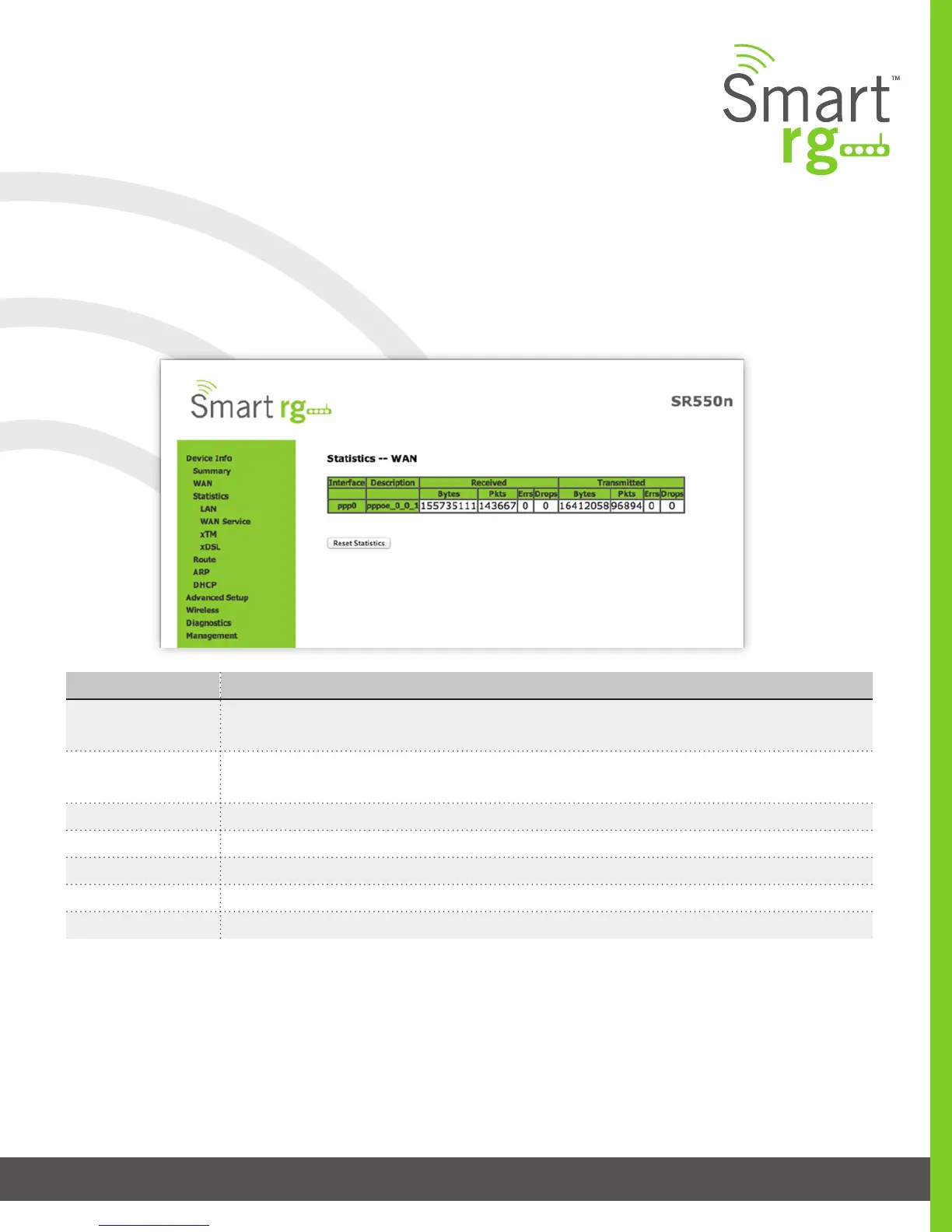 Device Info -> Statistics -> WAN displays the TX/RX Bytes, Packets, Error and Drops for each WAN interface for your SmartRG