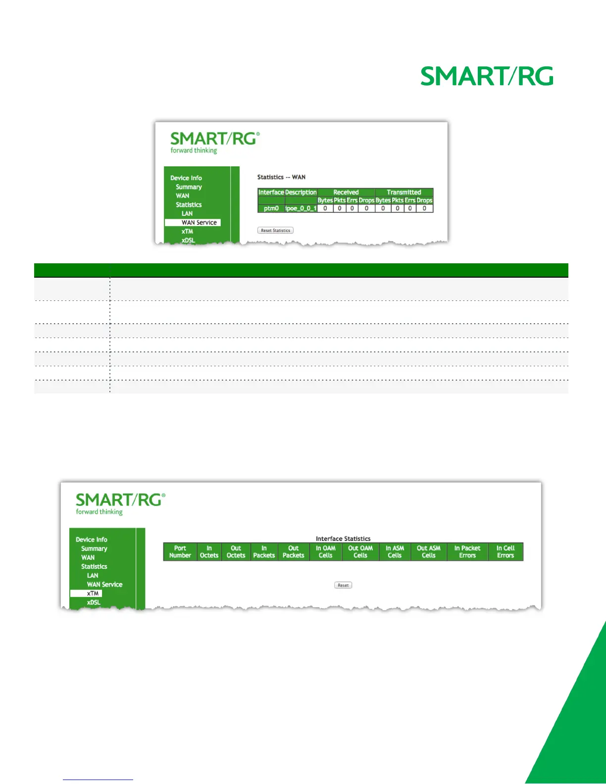 The Device Info -> Statistics -> xTM displays the ATM/PTM statistics for your SmartRG Gateway. All WAN interfaces configured for your