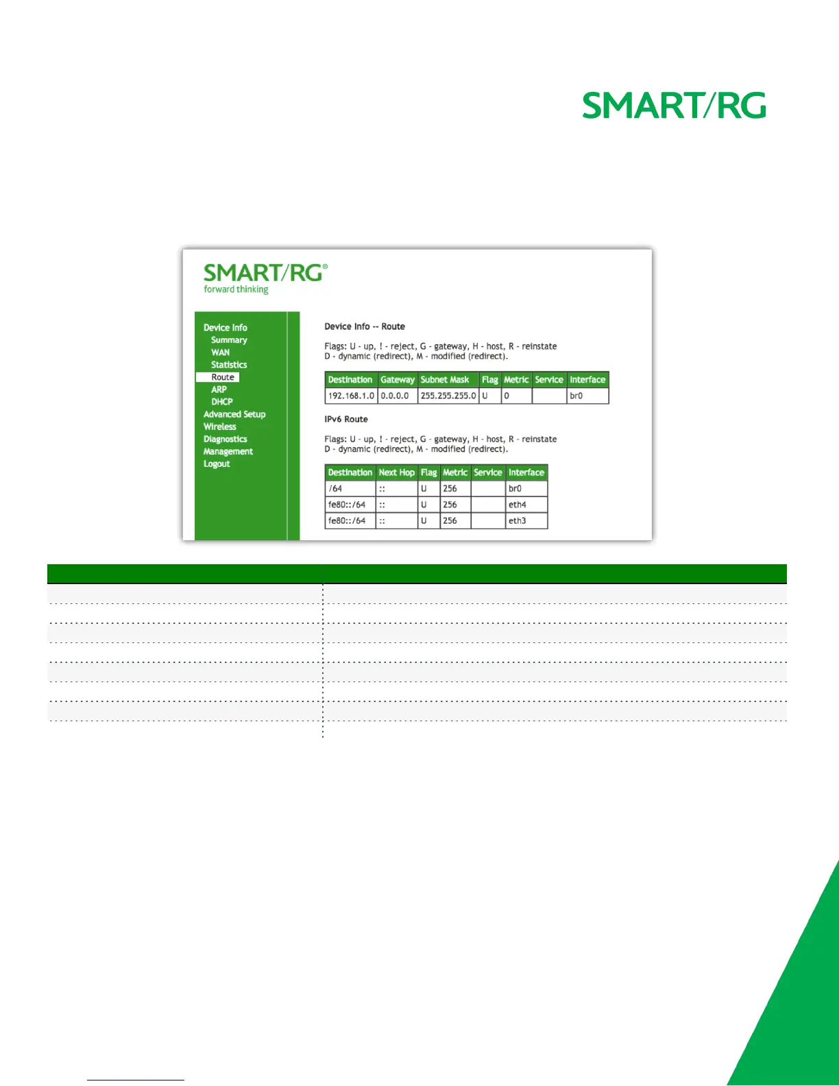 Th eDevice Info -> Route displays the LAN and WAN route table information configured in your SmartRG Gateway for both IPv4 and IPv6