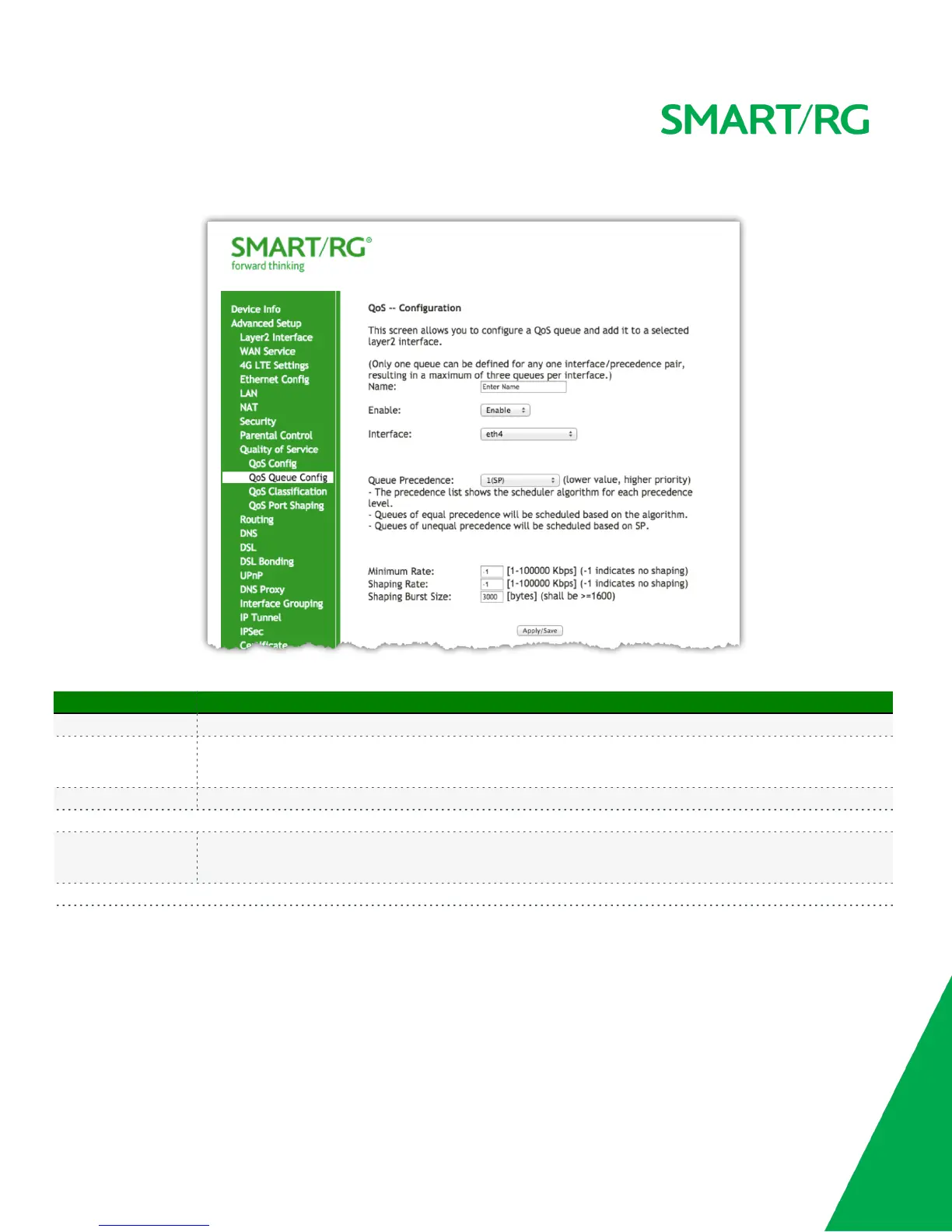After selecting Advanced Setup -> Quality Of Service -> QoS Queue Config, click the button. The following screen will appear to facilitate the