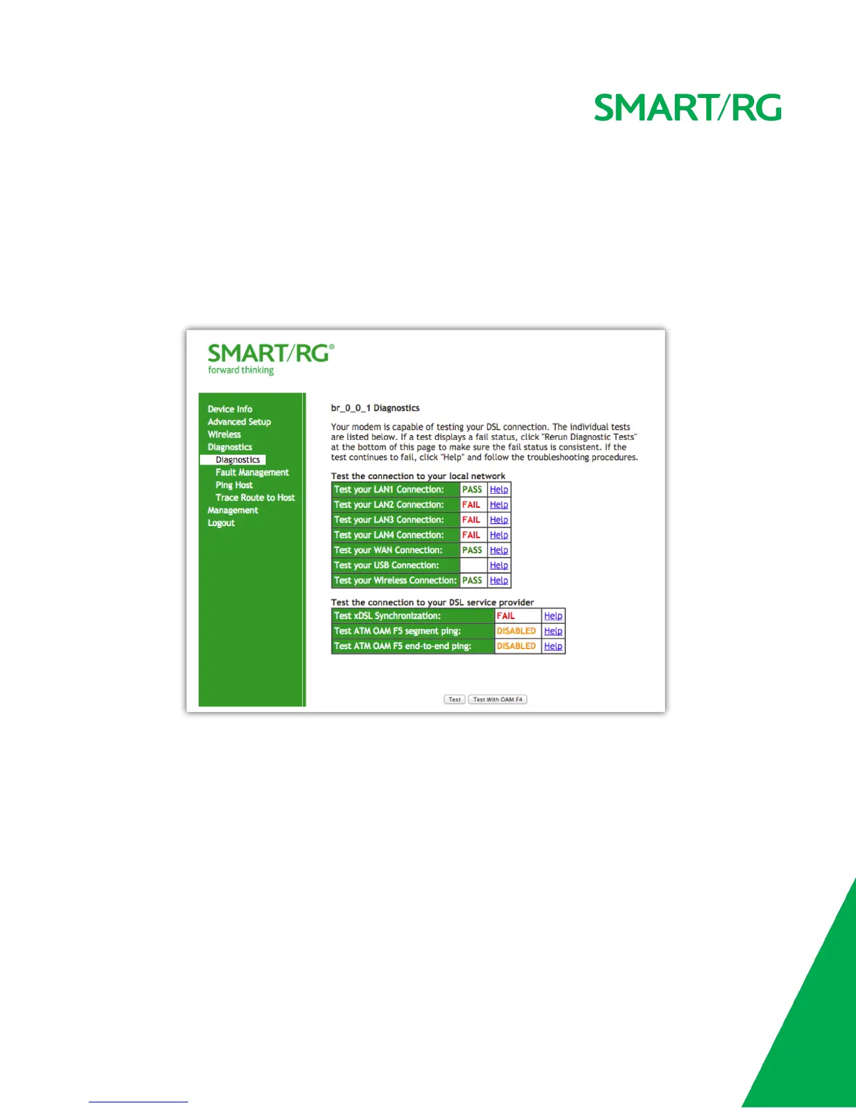 Utilize this screen for diagnostics regarding your VDSL PTM or Ethernet WAN connection. Fault Management is compliant with IEEE 802.1ag for