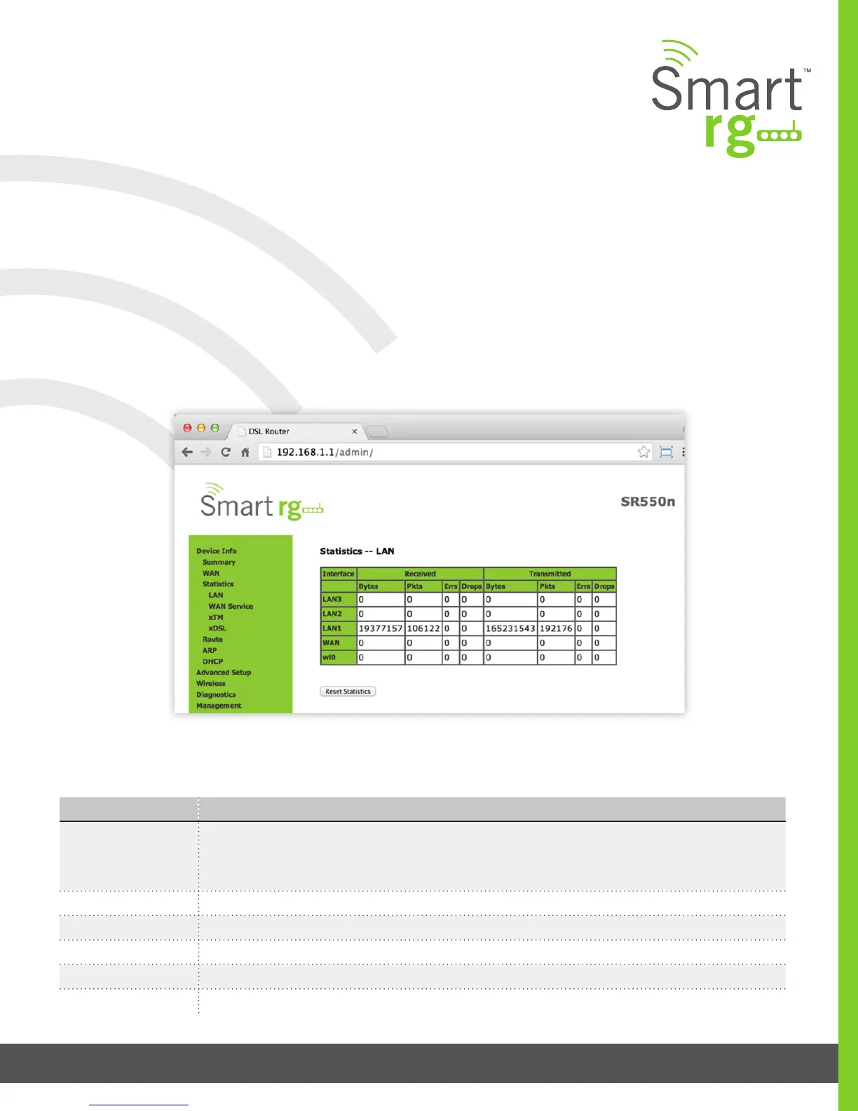 Device Info -> Statistics -> LAN displays the TX/RX Bytes, Packets, Error and Drops for each LAN interface for your SmartRG