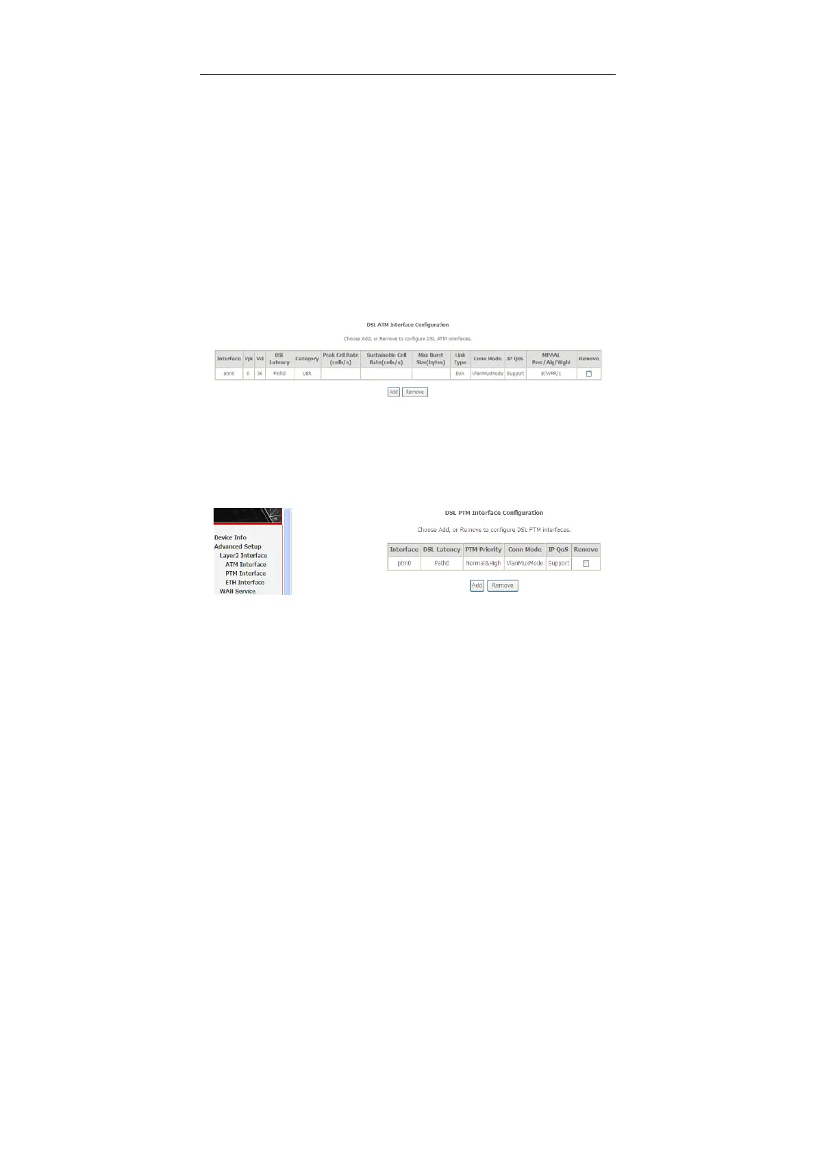 page appears. In this page, you can add or remove to configure PTM WAN