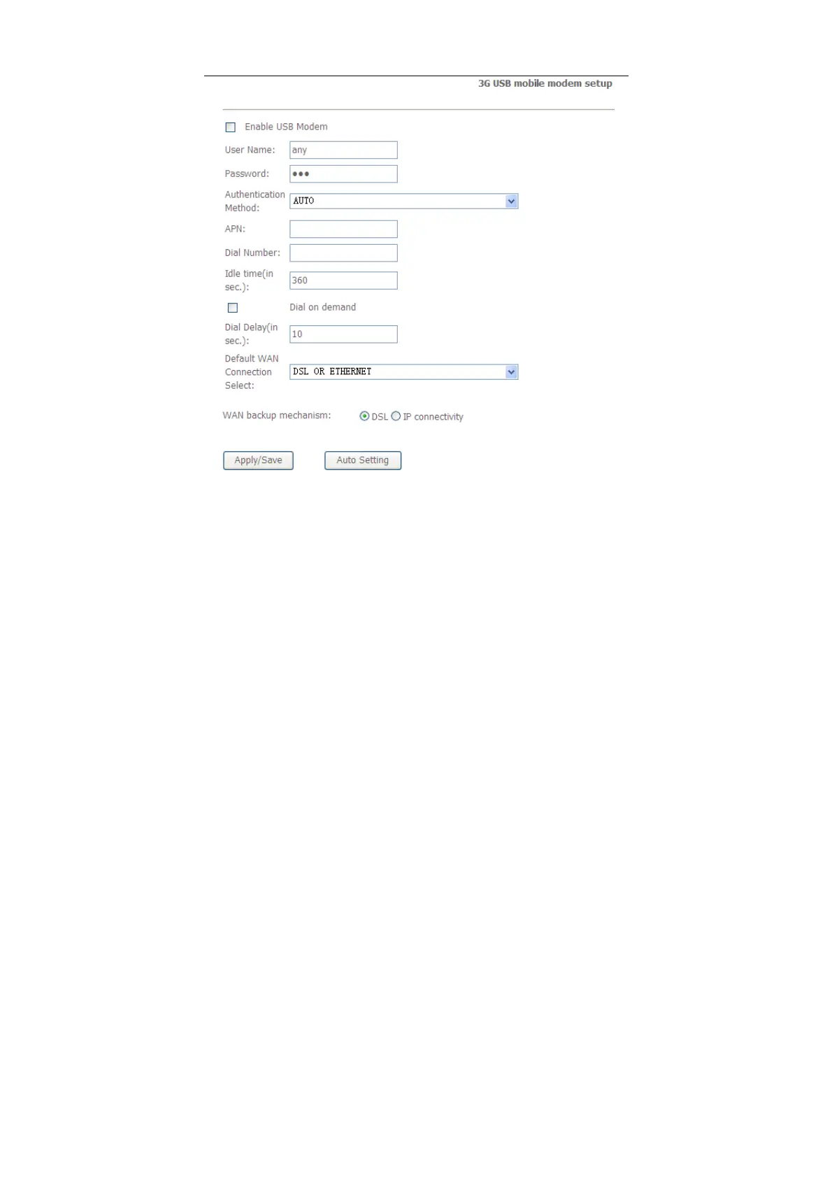 In this page, you are allowed to configure the settings of the 3G USB modem.