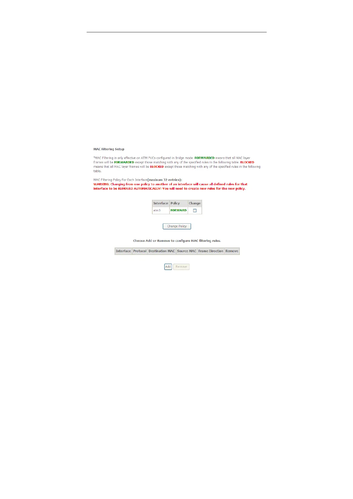 MAC filtering is only effective on ATM PVCs configured in bridge mode.