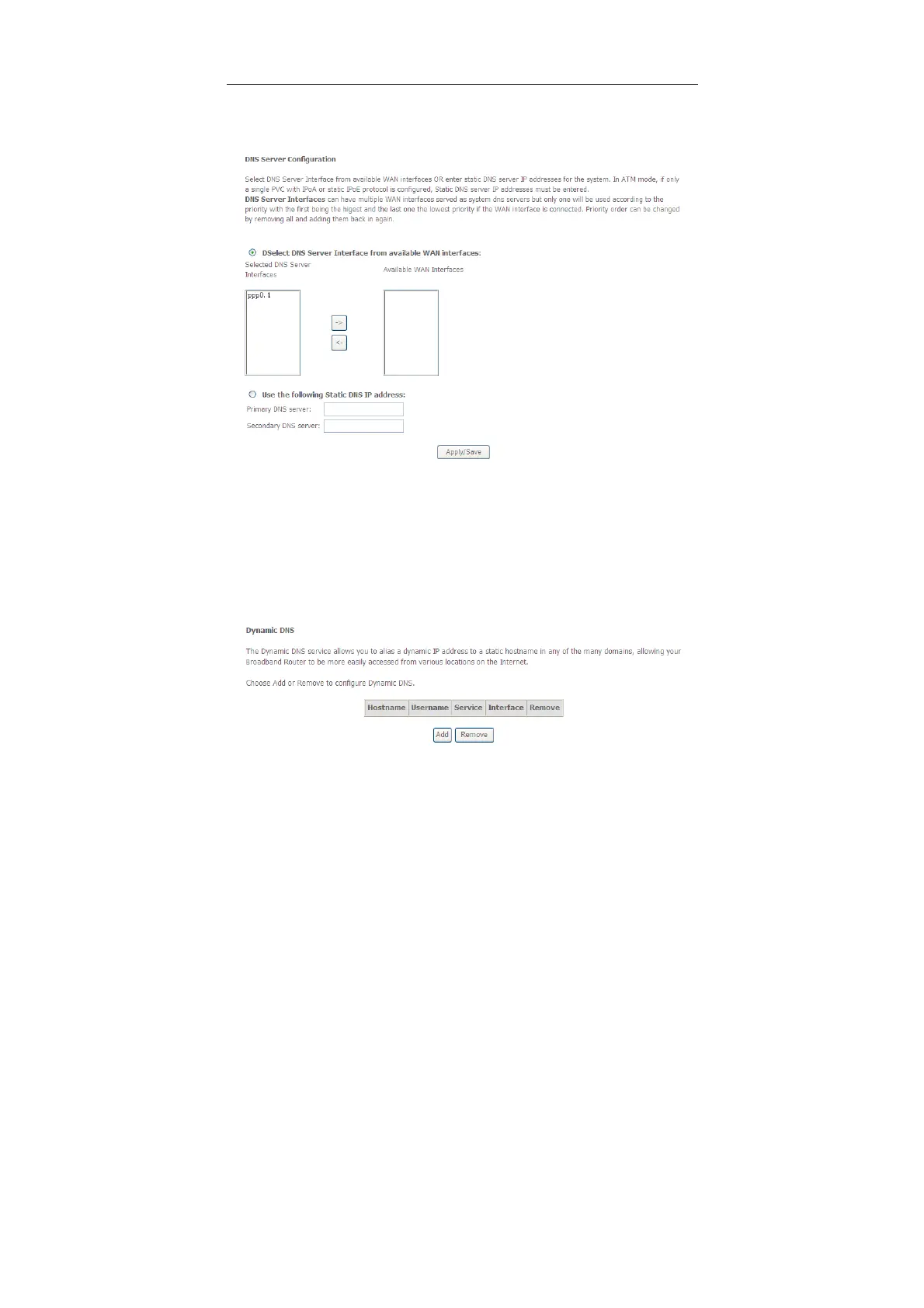 After finishing setting, click Apply/Save to save and apply the settings.