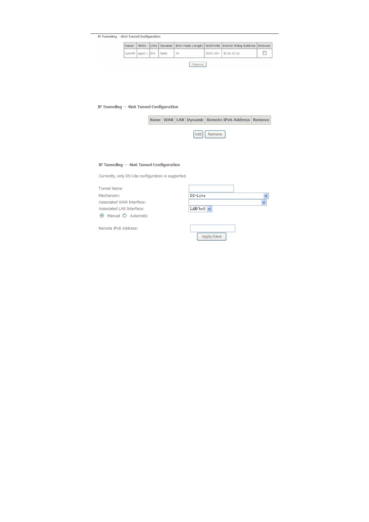 Choose Advanced Setup > IP Tunnel > IPv4inIPv6 and the following page