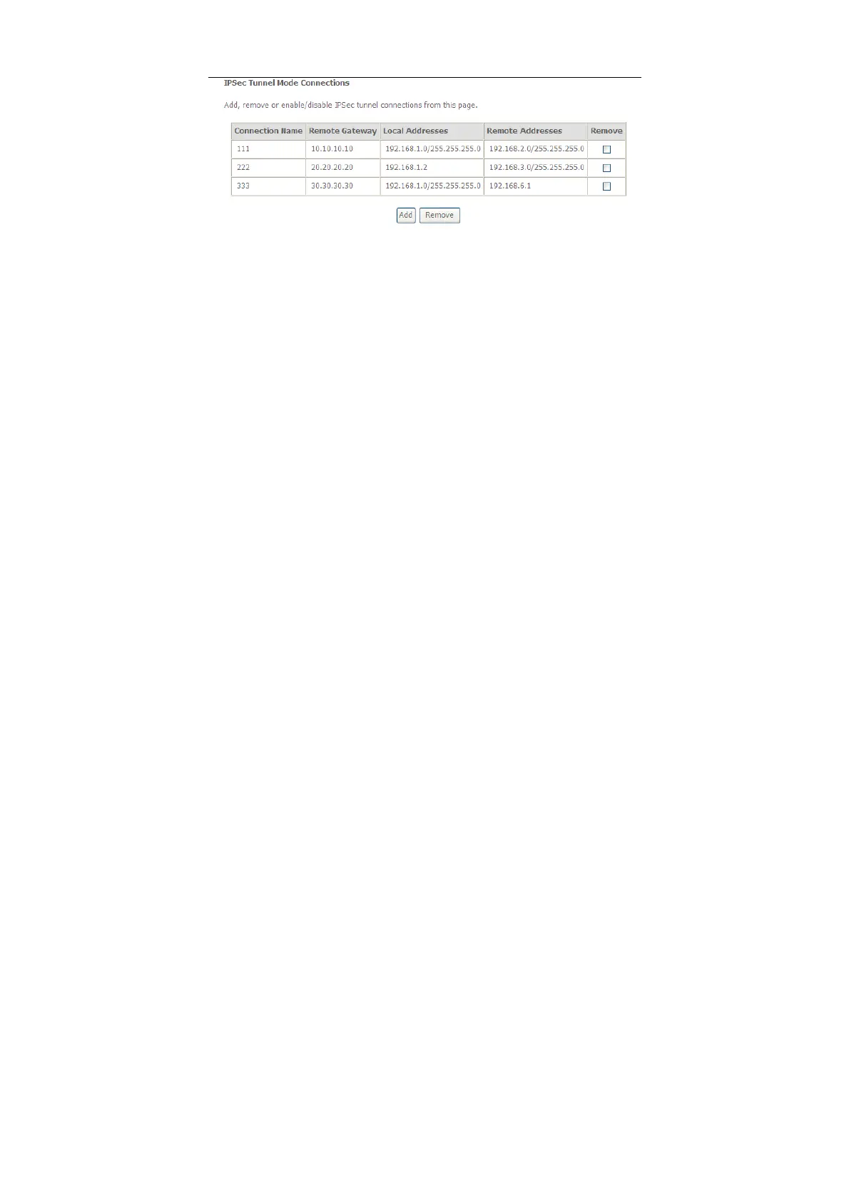 In this page, you can add or remove the IPSec tunnel connections.
