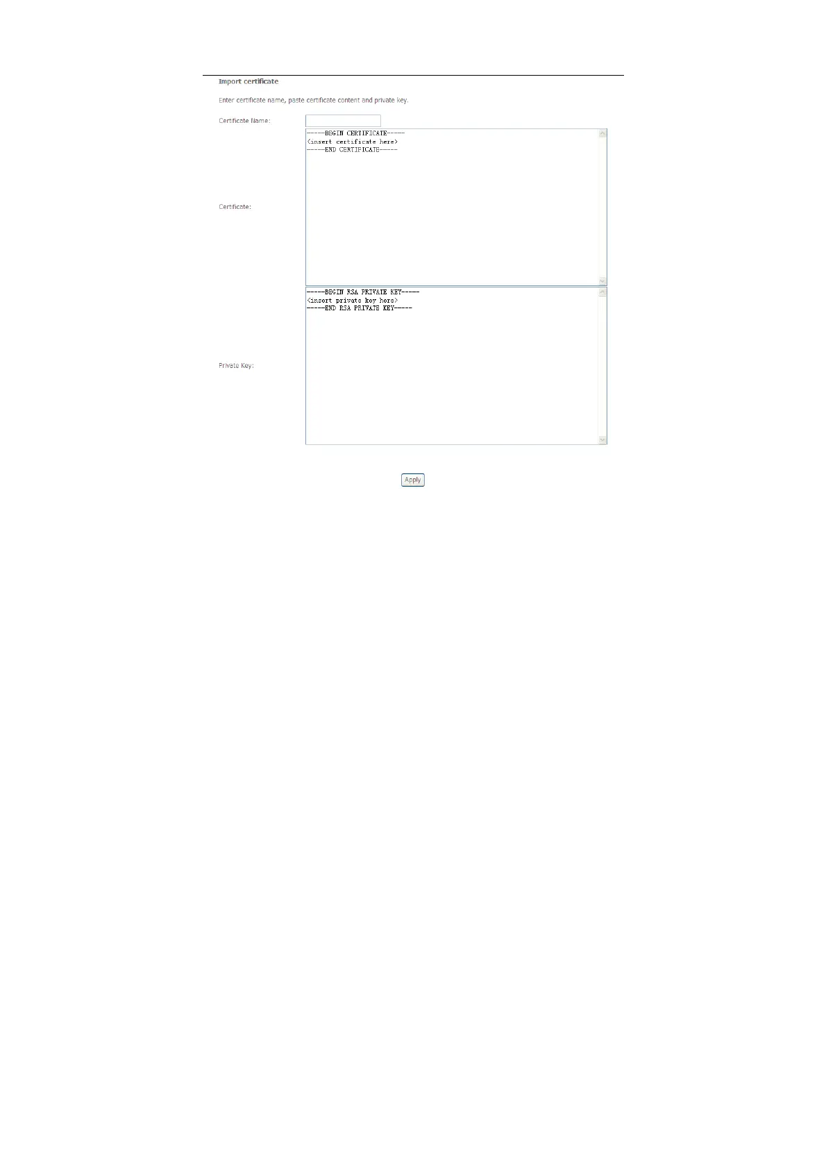 In this page, paste the certificate and the private key. Finally, click the Apply button