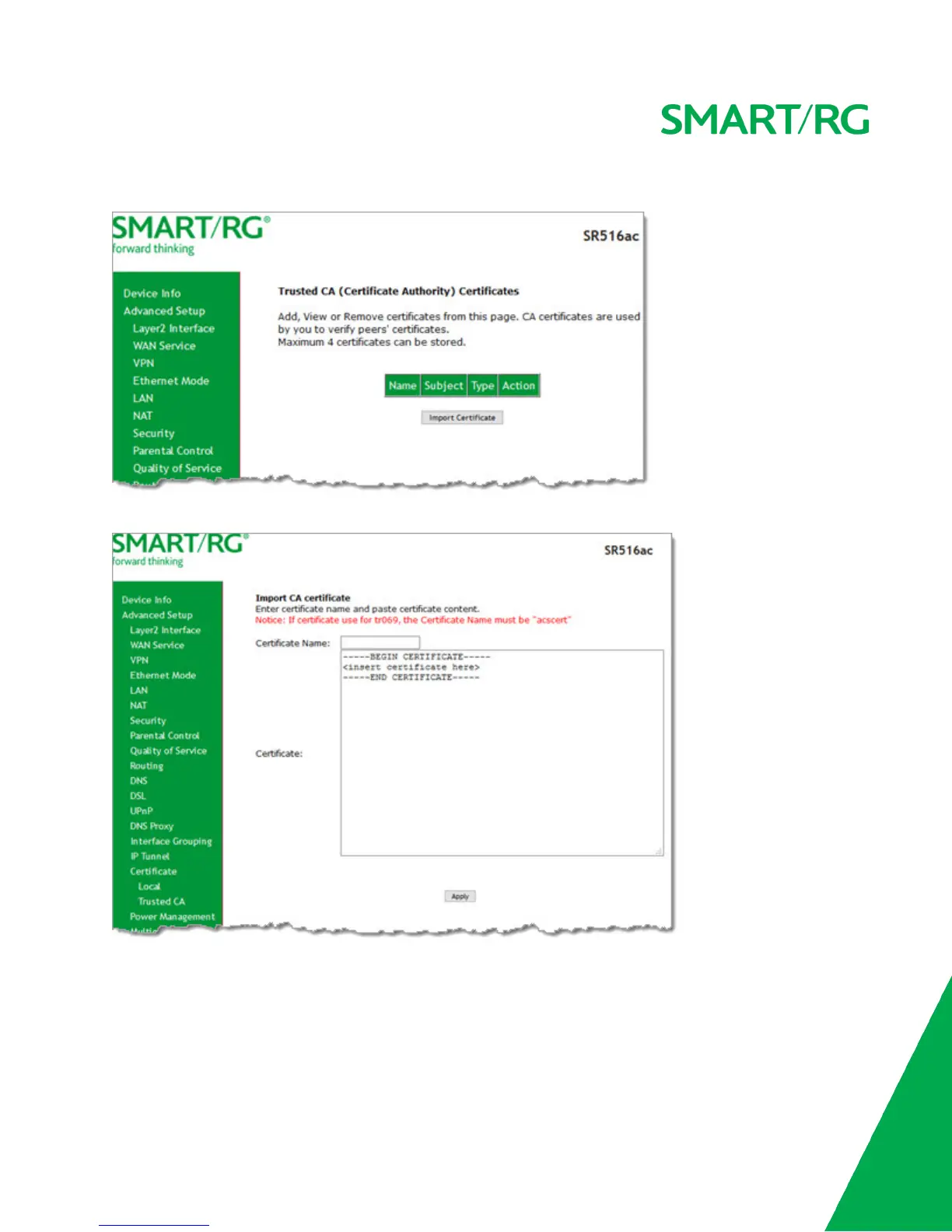 1. In the left navigation bar, click Advanced Setup > Certificate > Trusted CA. The following page appears.