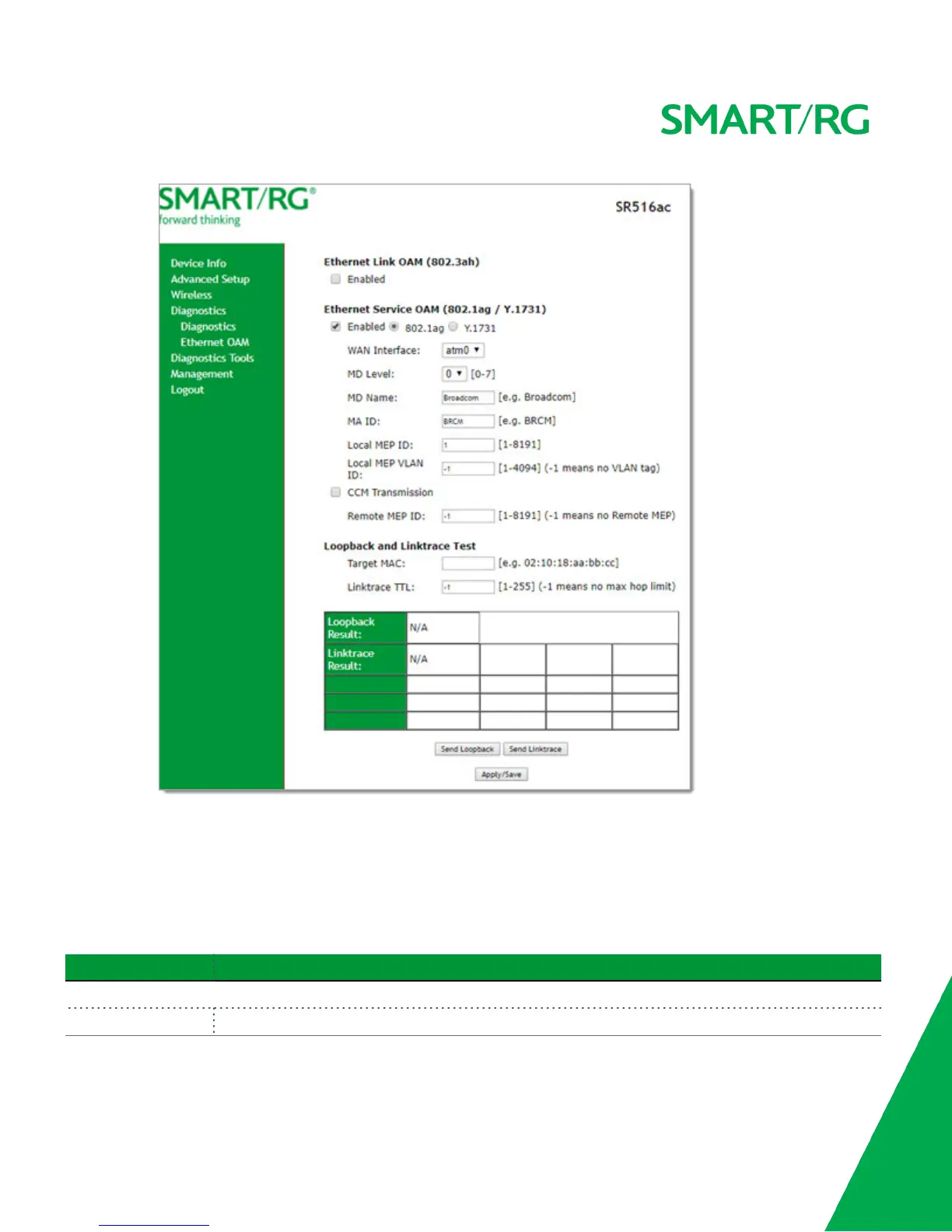 6. To run a linktrace test, enter a MAC address in the Target MAC field and click Send Linktrace at the bottom of the page.