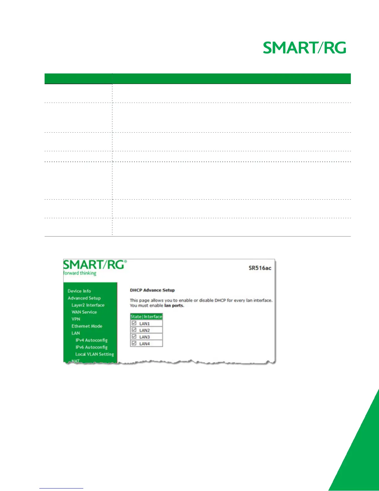 b. Click the State checkboxes as needed to manage DHCP for each LAN interface in the table, and then click