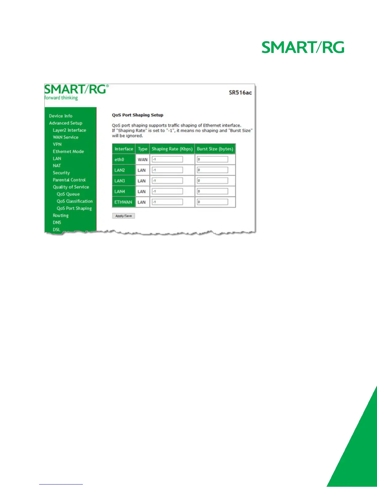 1. In the left navigation bar, click Advanced Setup > Quality Of Service > QoS Port Shaping. The following page appears.