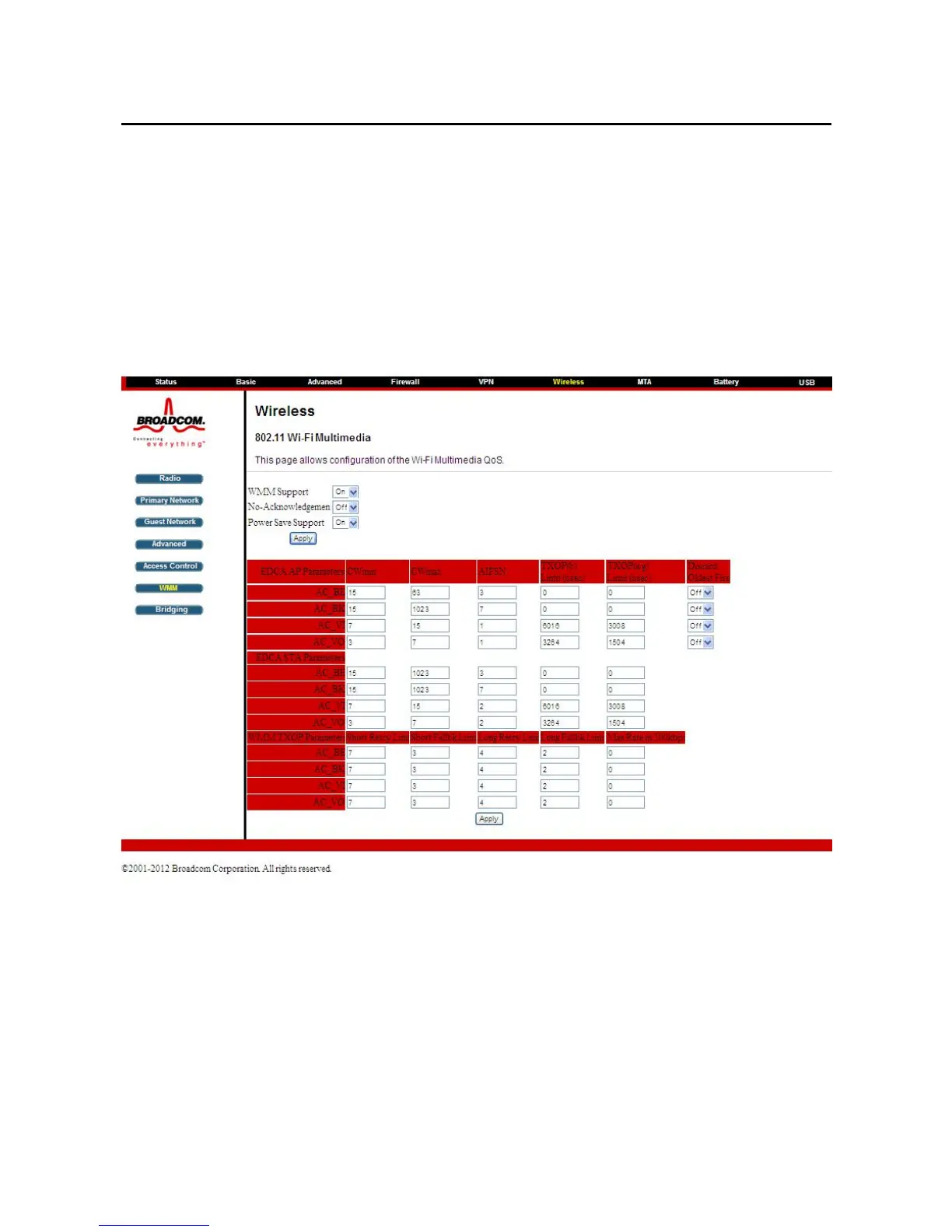 This page allows you to configure WiFi Multi-Media (WMM). WMM is an