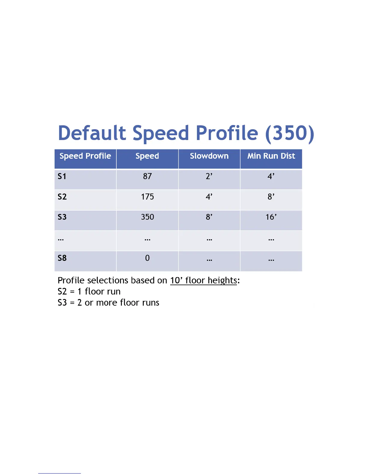 Since a 1-Floor run is 10’, the S2 Speed Profile is used because the Min Run