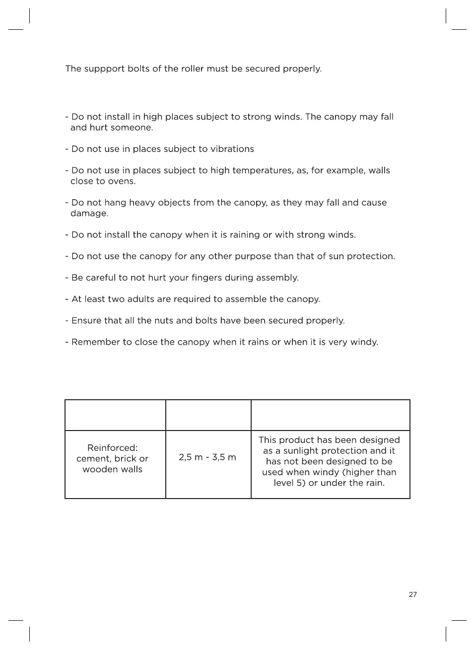Type of wall Height Atmospheric conditions