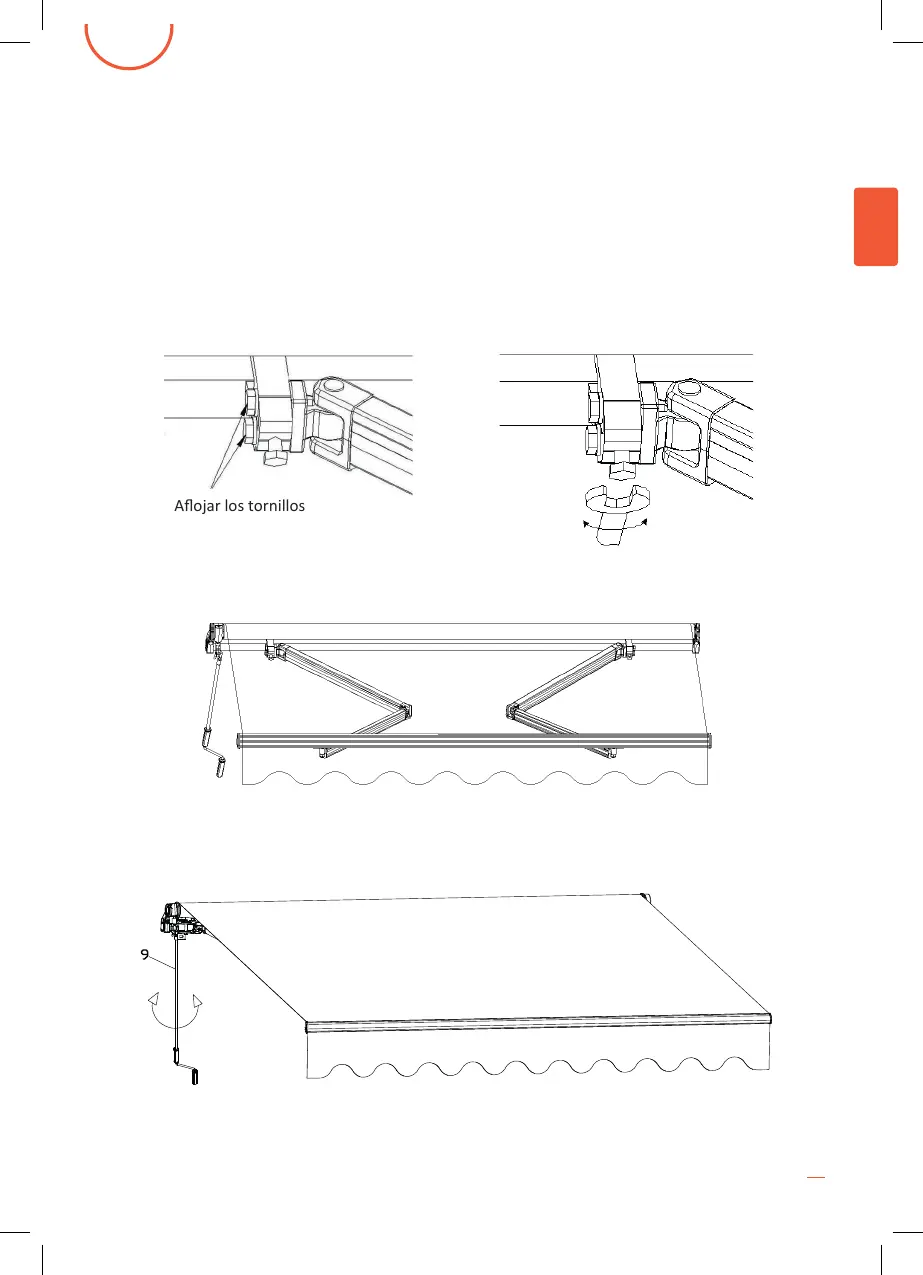 Abrir el toldo con la manivela. Asegúrese de que la barra frontal queda correctamente nivelada