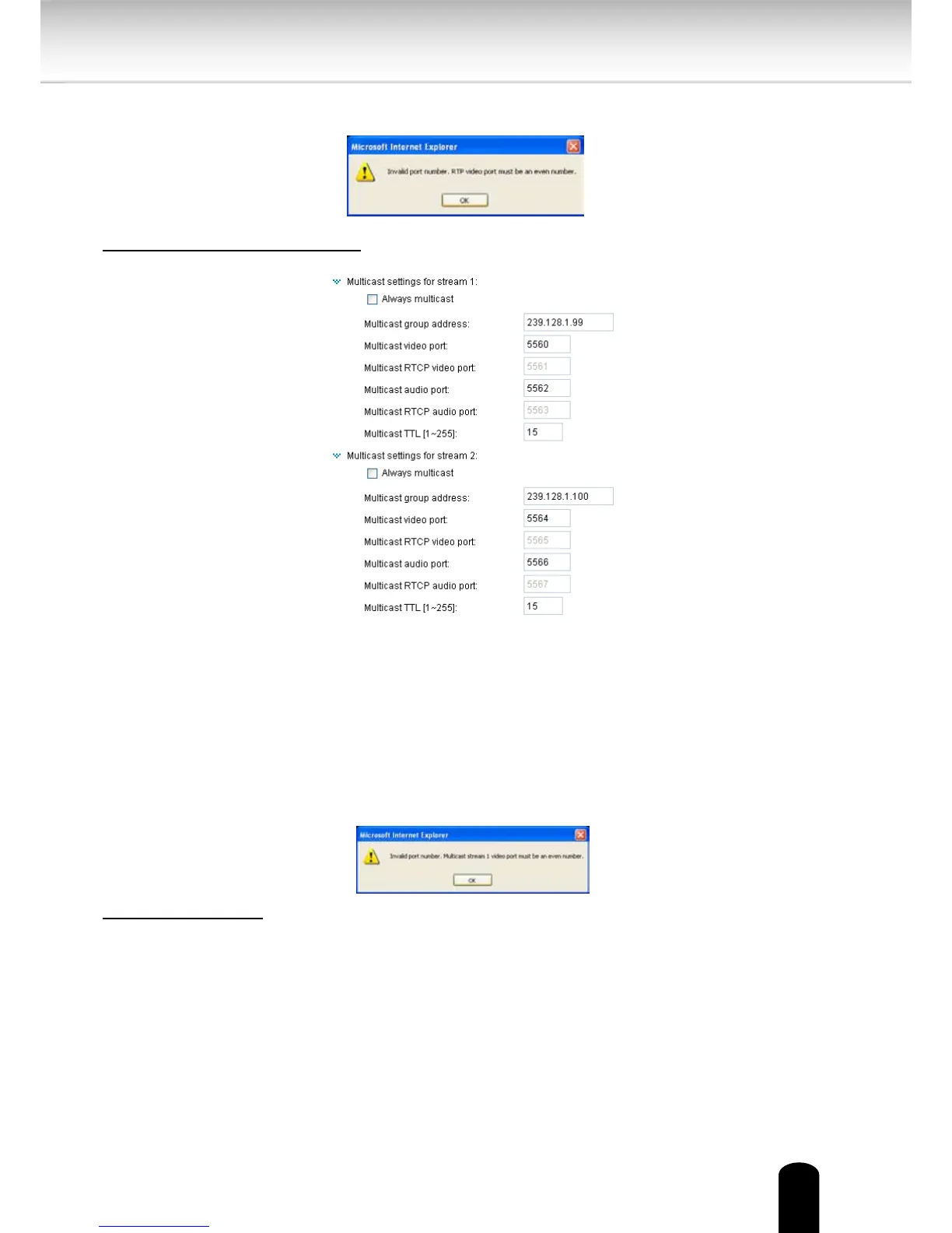 If the multicast RTP video ports are incorrectly assigned, the following warning message will be