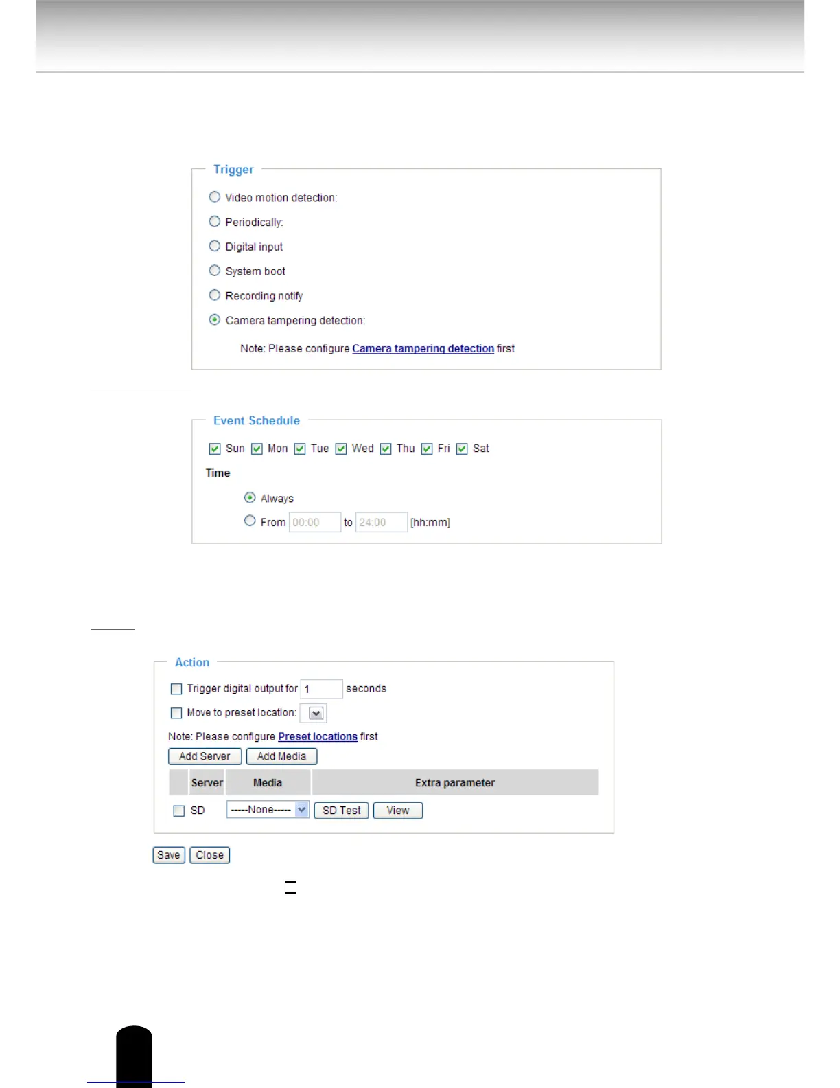 Dene the actions to be performed by the Network Camera when a trigger is activated.