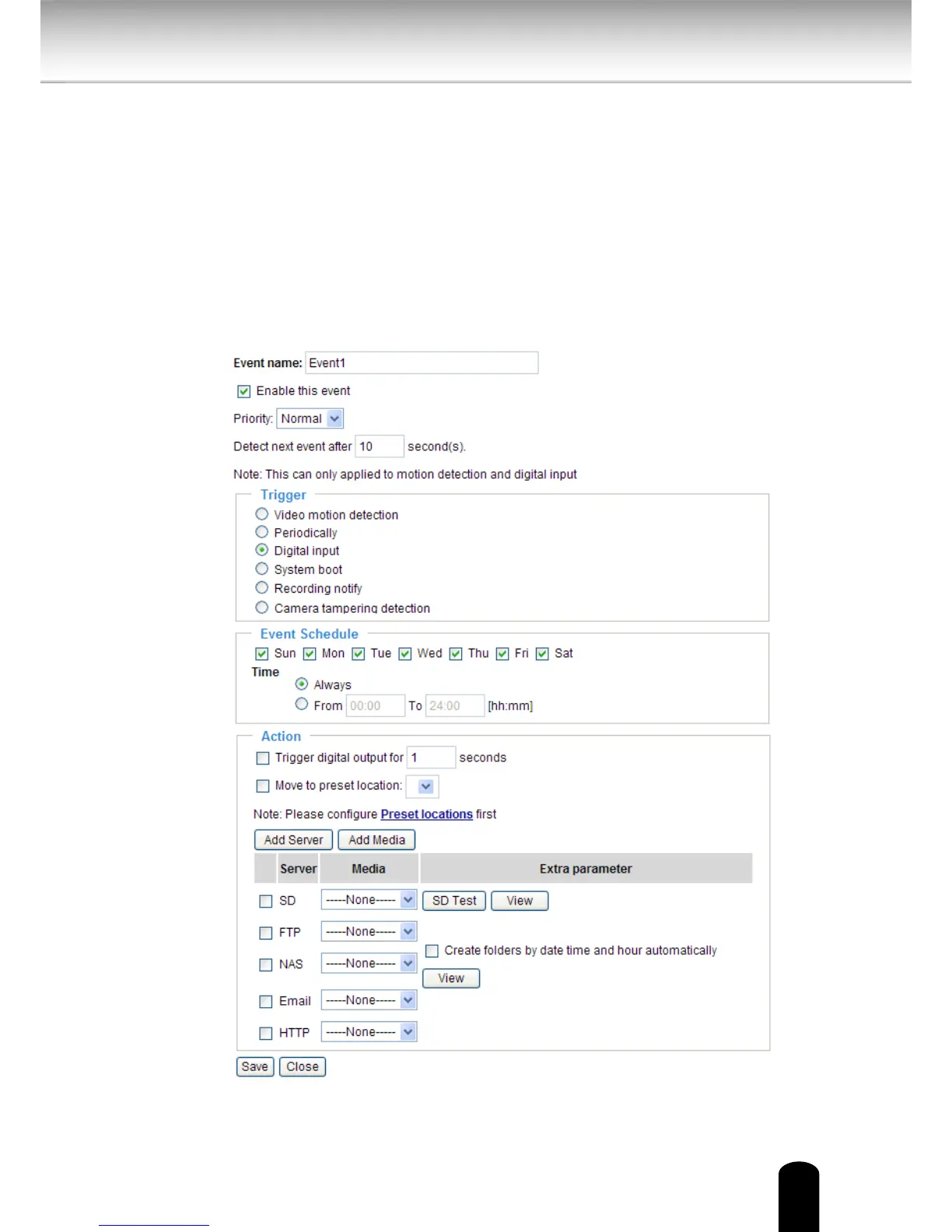 server and media settings so that the Network Camera will know what action to take