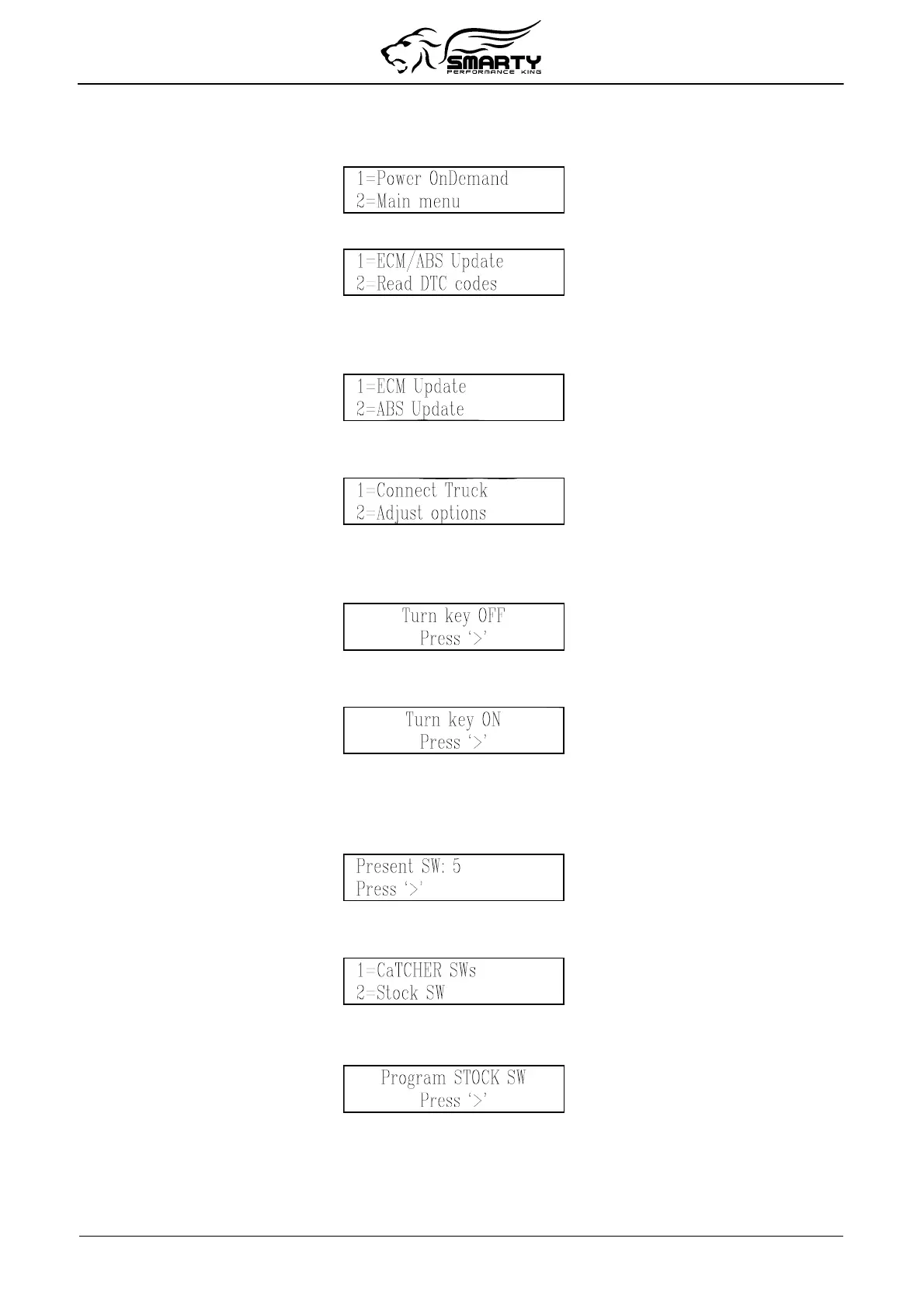 Turn the ignition key to “OFF”. Press the ‘>’ key. Smarty will then ask you to turn on the ignition