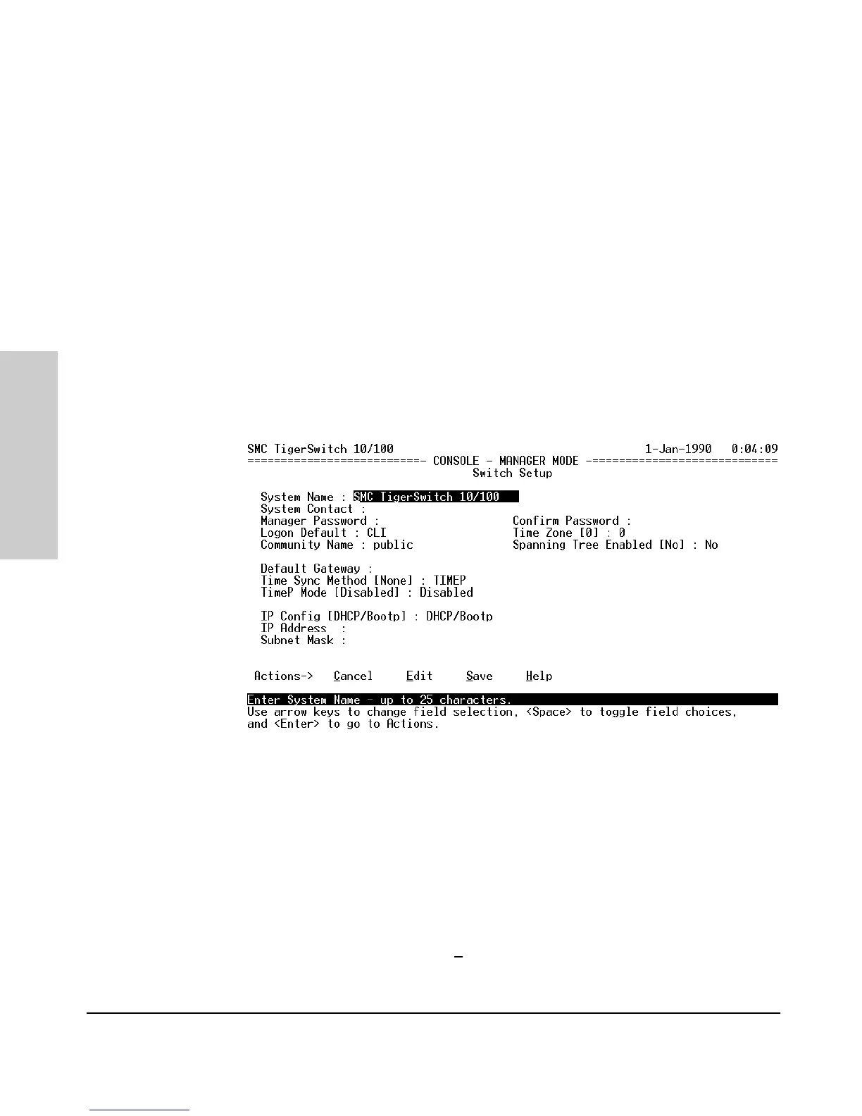 4. Tab to the IP Config (DHCP/Bootp) field and use the Space bar to select the