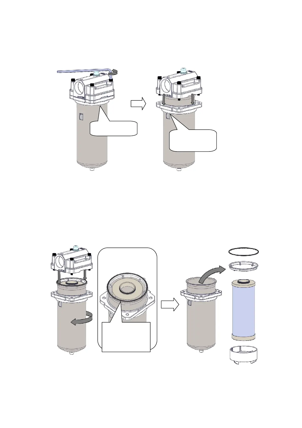 E) Remove the used element and O-ring from the bowl.