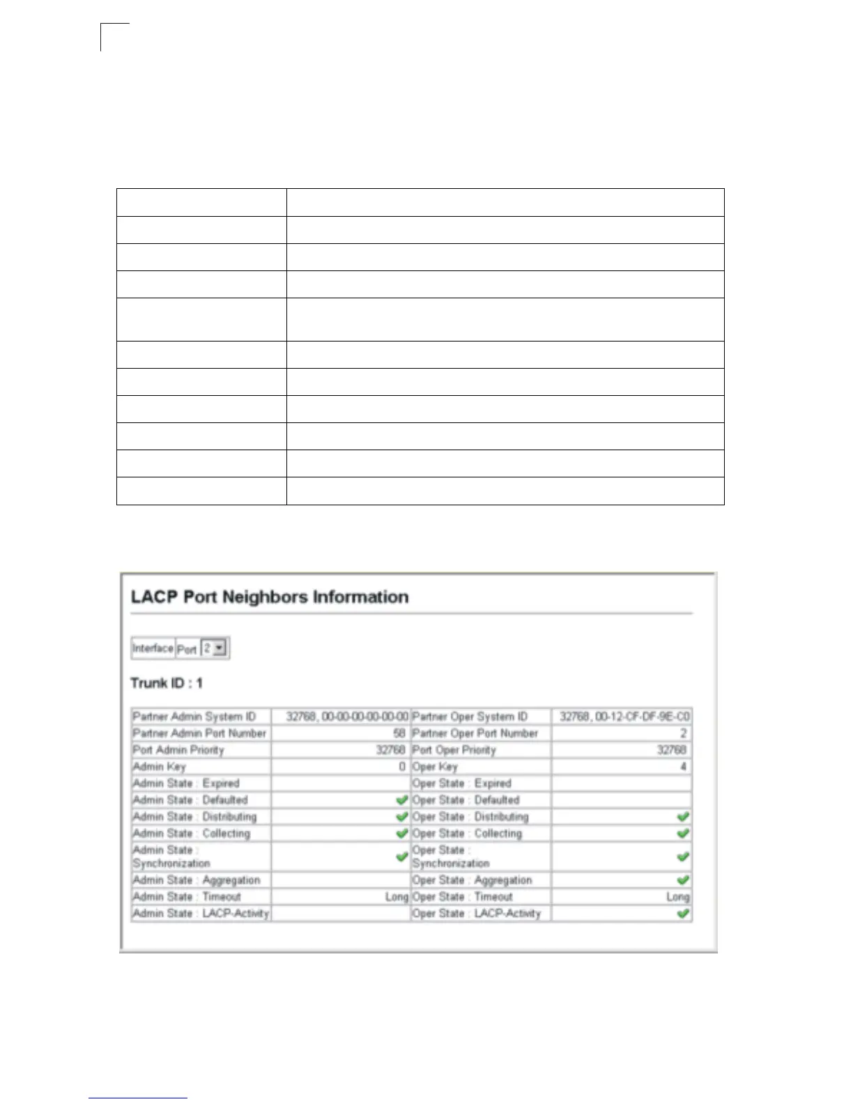 Partner Oper System ID LAG partner’s system ID assigned by the LACP protocol.