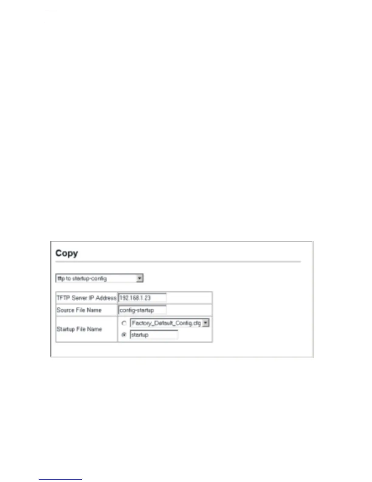 Web – Click System, File, Copy Operation. Select “tftp to startup-config” or “tftp to