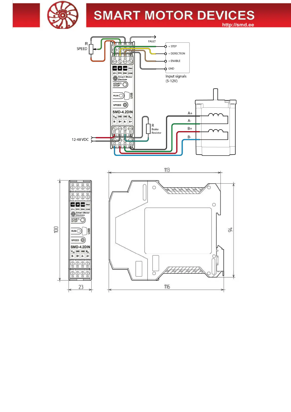 Fig. 1. Terminals of the stepmotor driver SMD-4.2DIN ver.2
