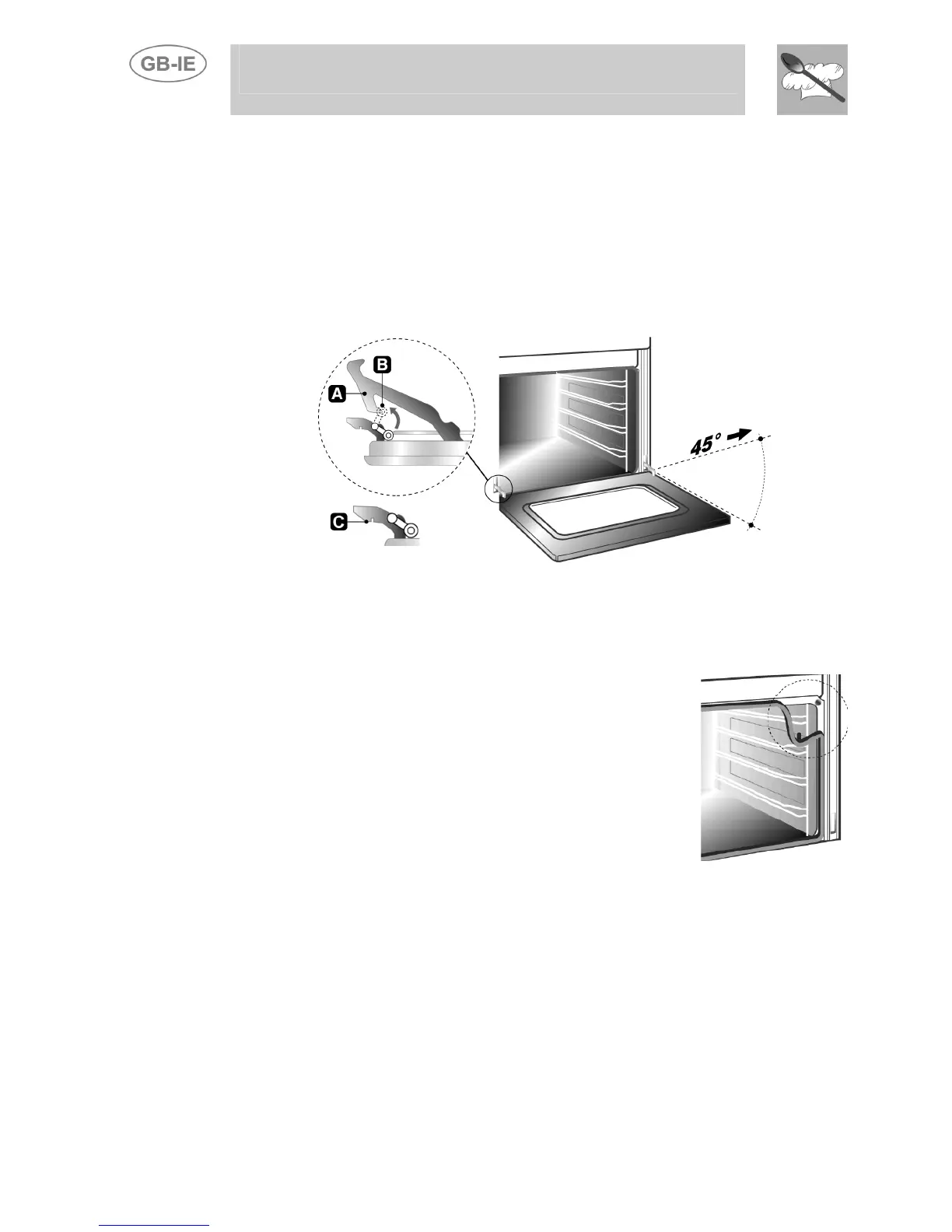 the hinges A into slots in oven frame. Locate the grooves (figure C) over